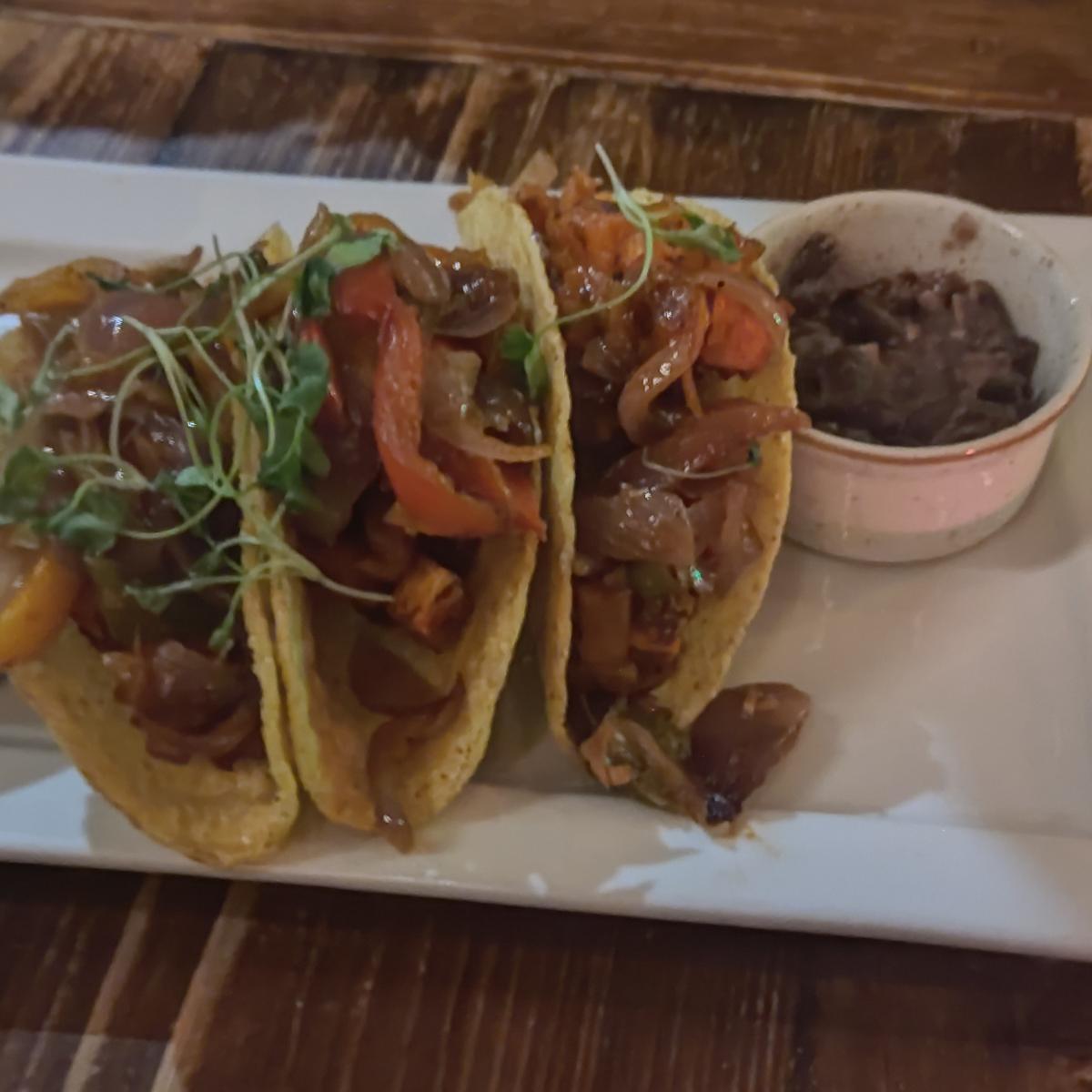 Crujientes tortillas de maíz rellenas de boniato asado, pimientos, cebolla y aliño mejicano. Servido con guacamole.