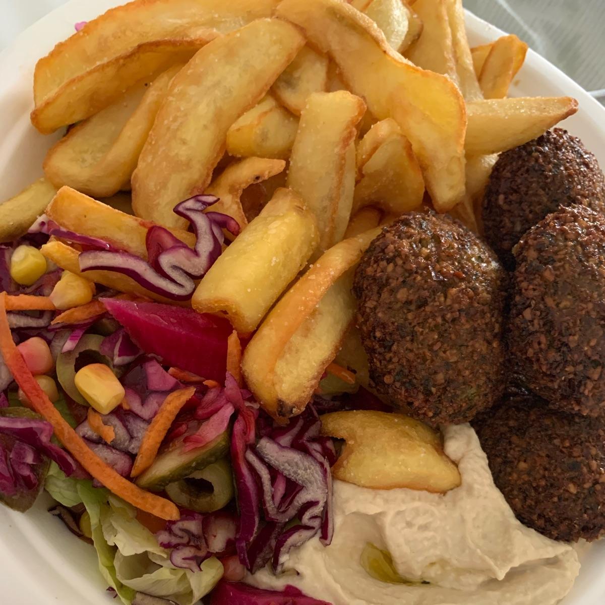 - Falafel: croquettes fait maison composés de pois chiches et mélangés à diverses épices, frites dans l'huile.