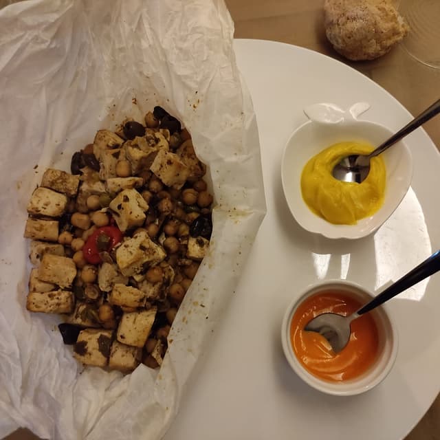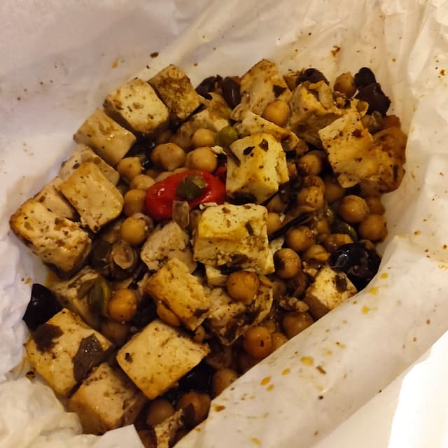 Un piatto davvero speciale 🤩 un cartoccio con ceci, tofu, olive taggiasche, pomodorini, alghe, capperi, olio, origano ed un profumo invitante di buono 🥰
