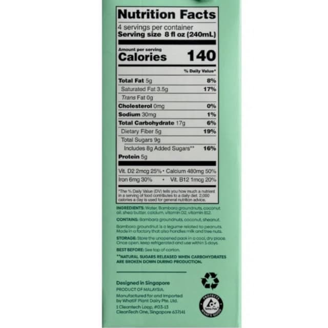 * Ingredients: Water, Bambara groundnuts, coconut oil, shea butter, calcium, vitamin D2 and vitamin B12
