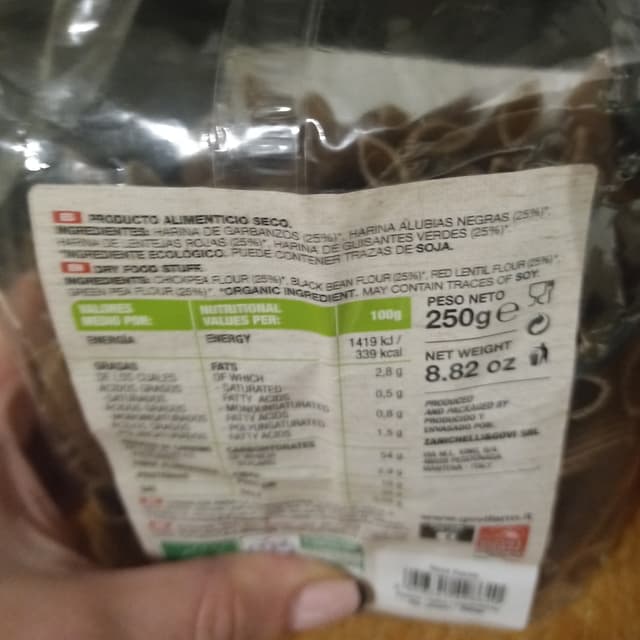 Pasta elaborada con harinas de garbanzo, alubia negra, lenteja roja y guisante de agricultura ecológica. El precio habitual no lo sé, ya que mi compañero de piso la compró de oferta en Carrefour, creo que por alrededor de 1€. Para ese precio, 250g de pasta sin gluten está genial, además ecológica y alta en proteína. Probablemente a su precio habitual no resulte tan económica, pero es una buena opción para aumentar proteínas. A nosotros el sabor nos ha gustado, no sabe a pasta de trigo pero es diferente, bastante suave.