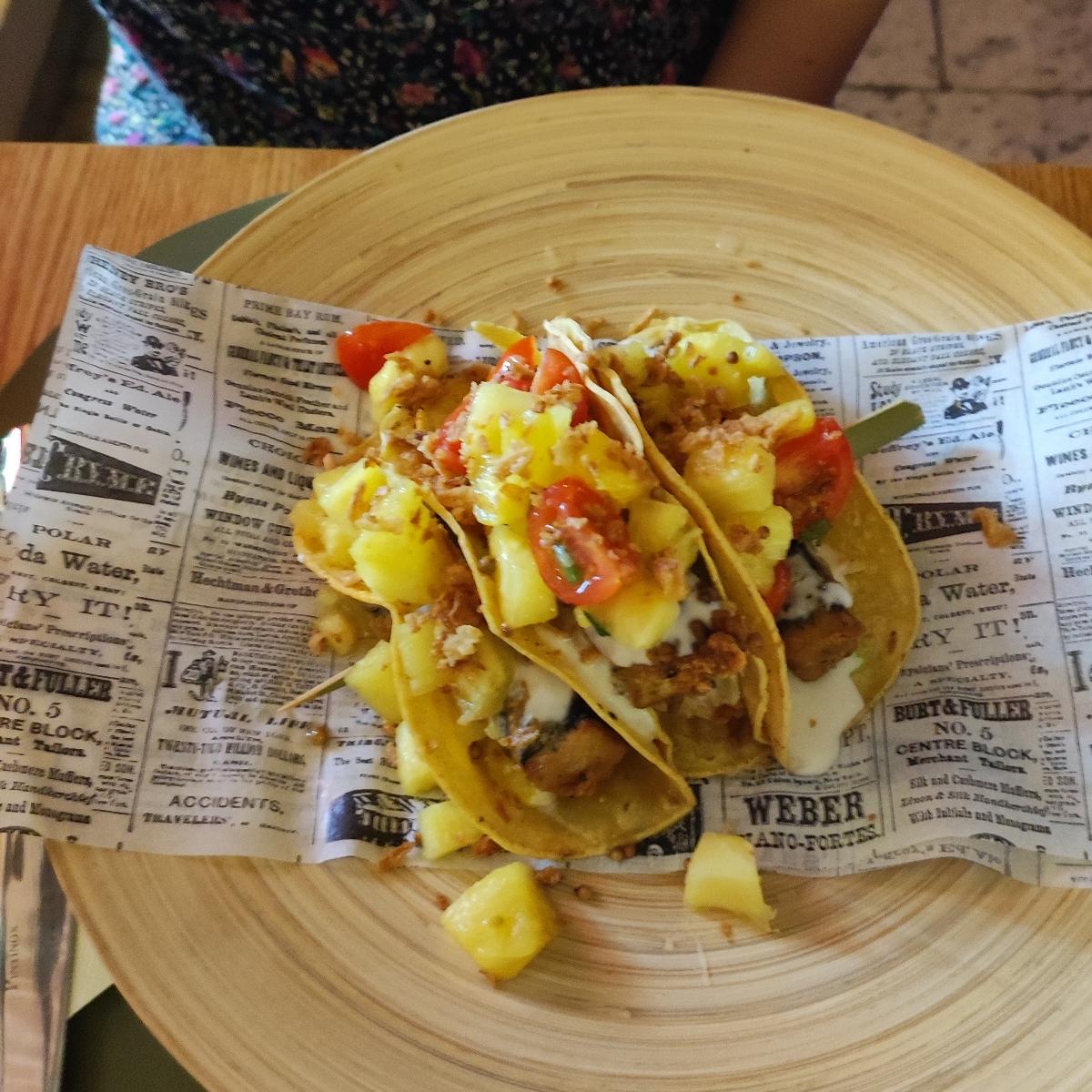 These #tofu tacos were delicious: the combination of the seaweed-coated, fried tofu and the #pineapple really works! Also, the portion is really generous and filling. The tortillas were not the crispiest, but it wasn't a problem at all. The dish costs 108 kuna.