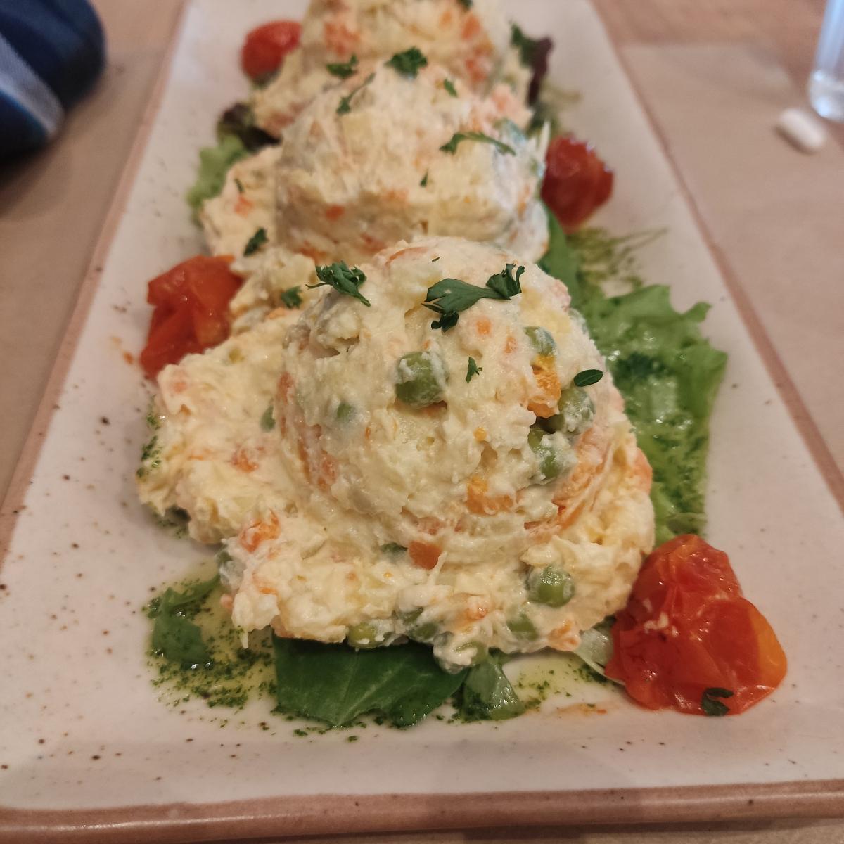 Ración generosa de ensaladilla rusa, acompañada de tomates cherry asados, ideal para compartir.