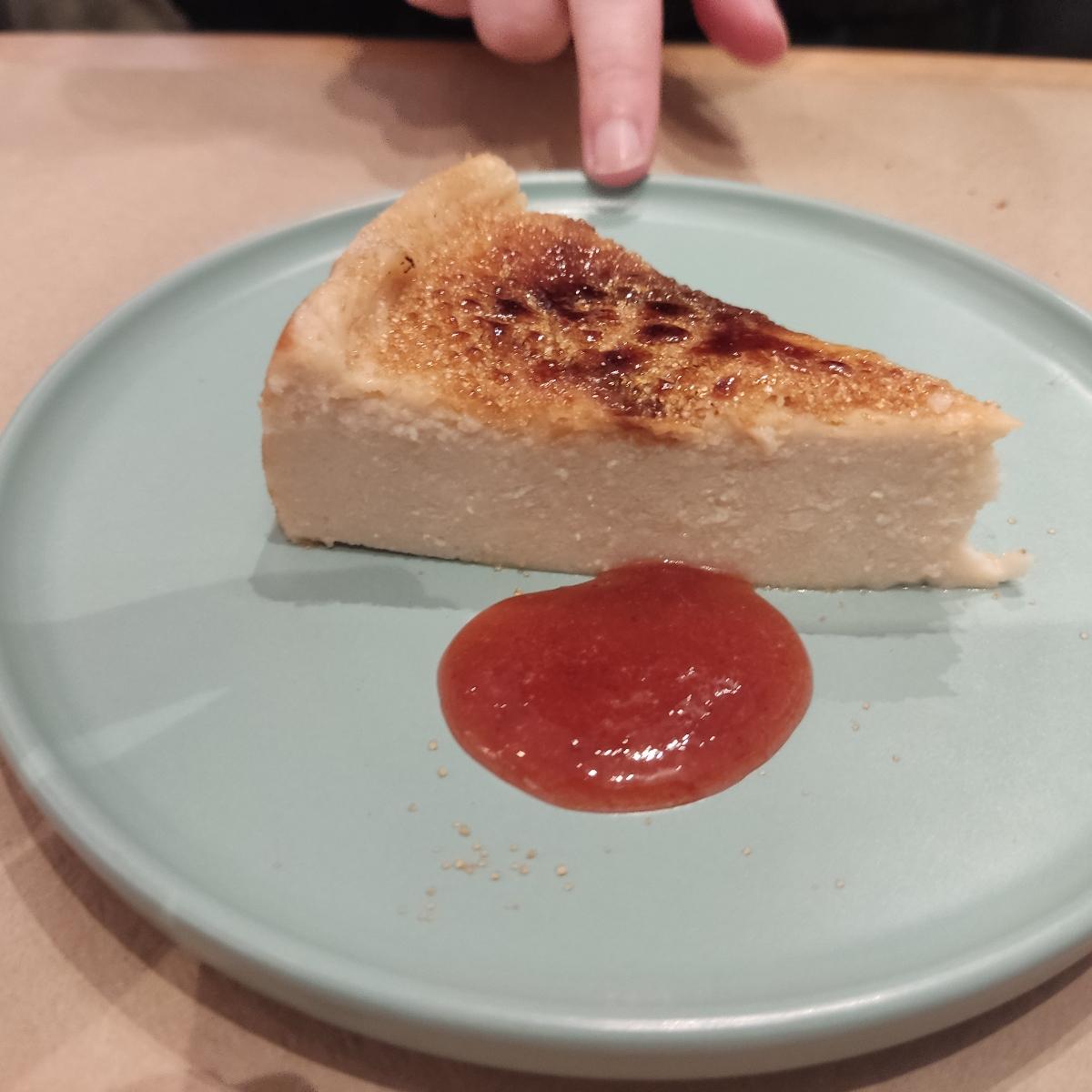Tarta de queso al horno acompañada de mermelada de fresa. Puede pasar prefectamente por su versión no vegana tanto en sabor como en textura. Un acierto para todos los públicos
