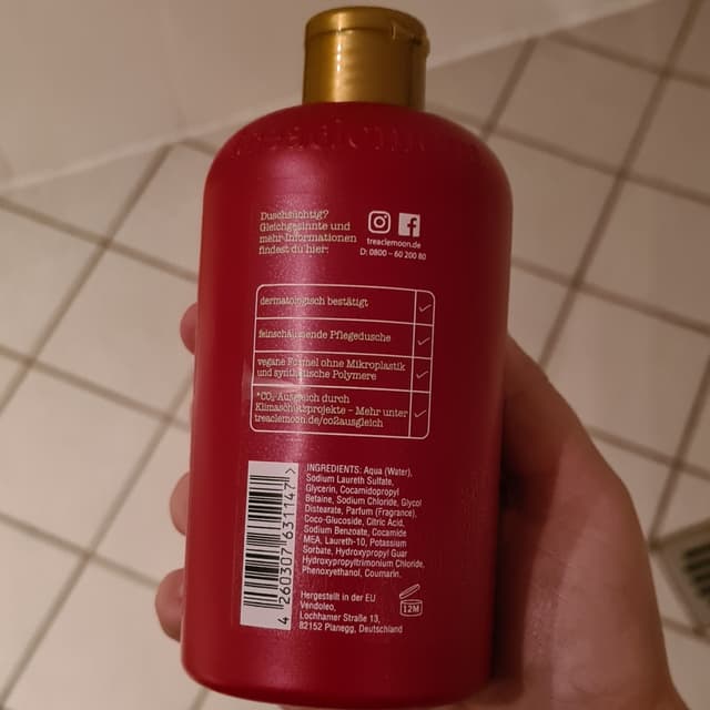 Shower gel with apple-cinnamon-scent in a CO2 neutral and recyclable package. The cinnamon smell is very strong but I love it. ~ 2,95€
