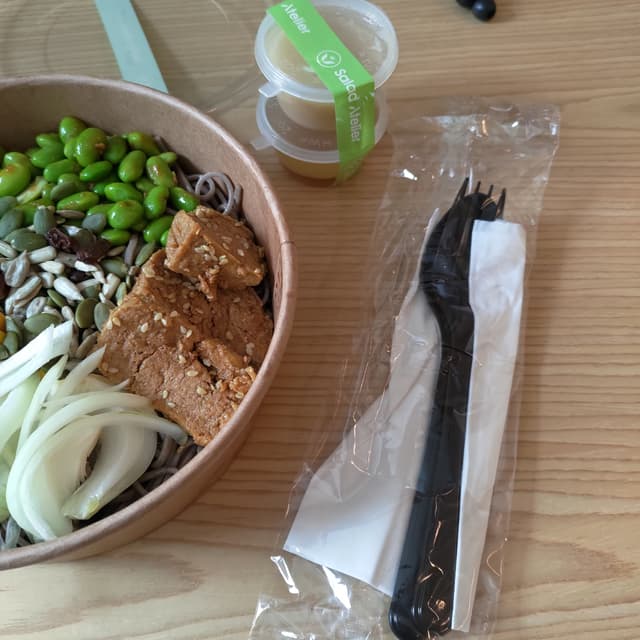 They operate a #saladbar concept, but offer predefined combinations with x and y of various items. This is the entry-level #rabbitfood option 😛, i.e. of the ones without meat, and it offers 6 of the fun elements alongside 1 carbs base and 2 dressings. They have vegan labels but then - annoyingly - choose not to use them on some manifestly vegan-friendly items 🙄 of which there is a generous selection 🙂