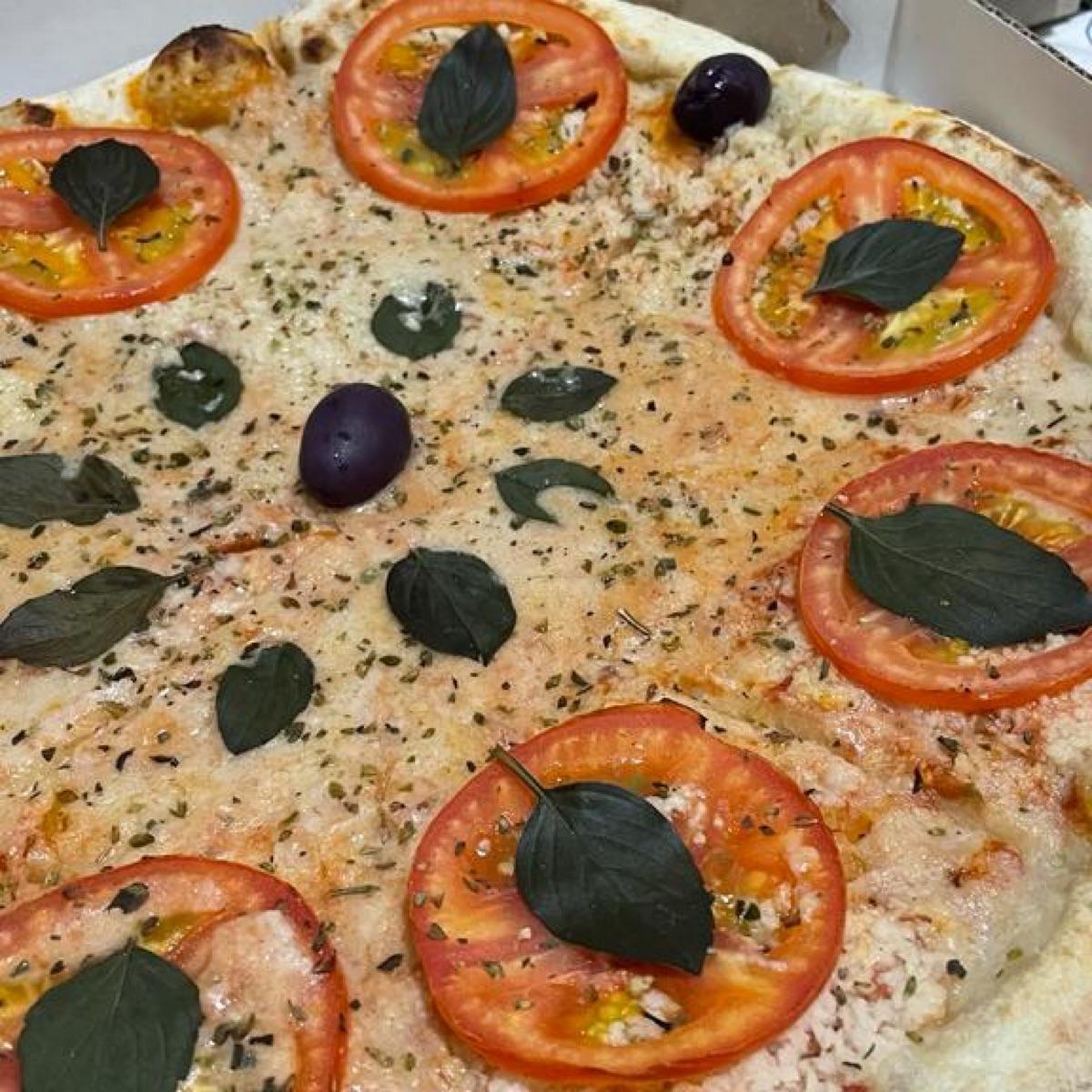 Pizza veguerita, massa fina, com muçarela de castanhas, tomates e folhas de manjericão.