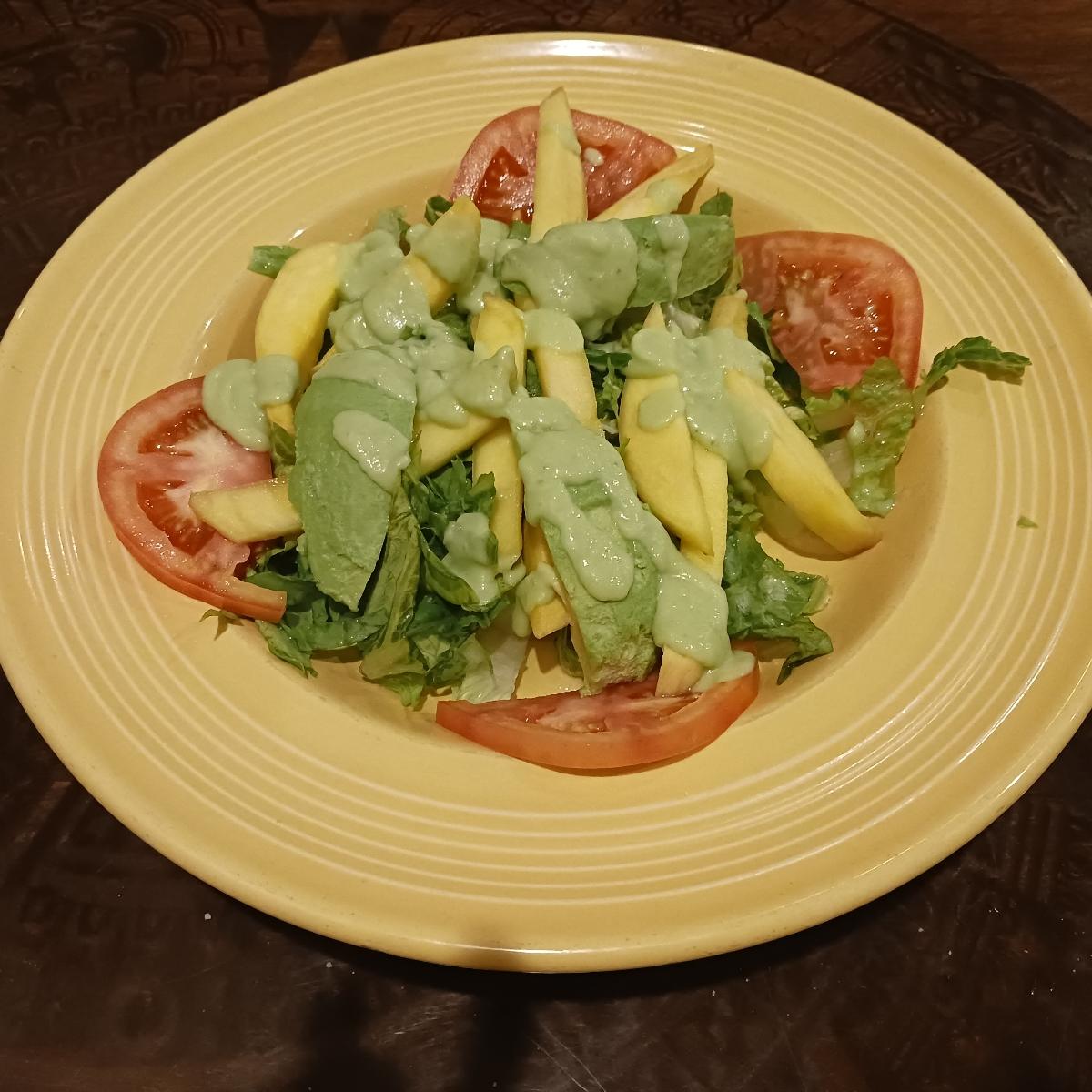 This salad contains tomatoes, mangoes, lettuce, and a few slices of avocado. It is a large portion size, so just half is enough for now! #vegansalad