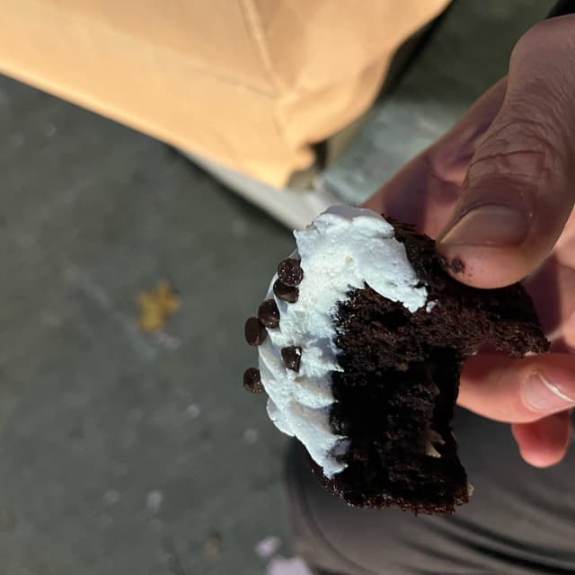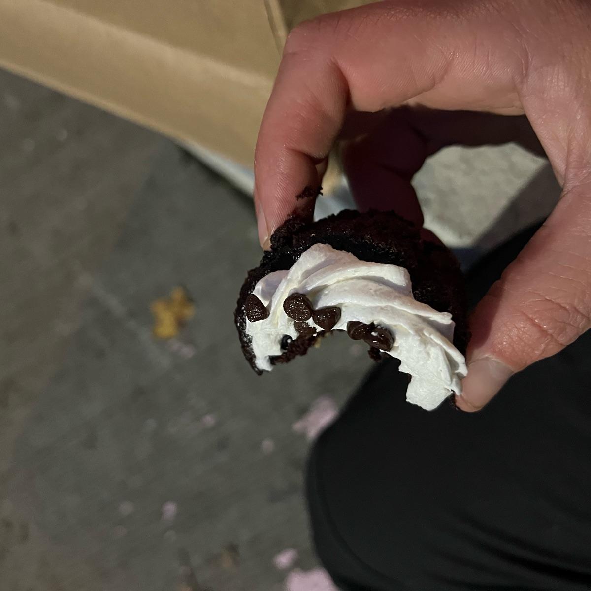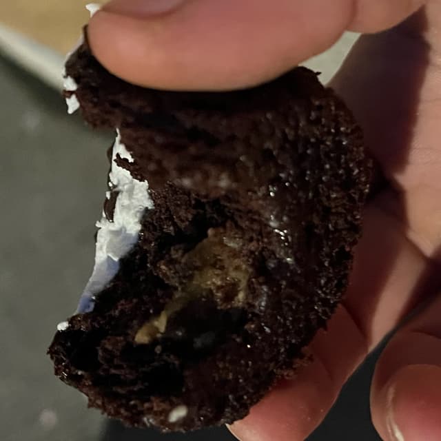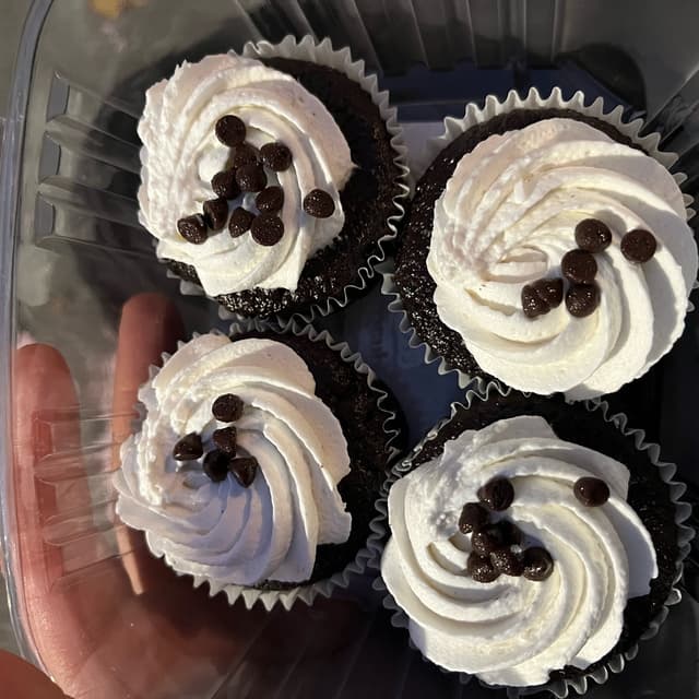 Heavenly with the whipped cream frosting and dark chocolate chip morsels sprinkled on top. To rich and decadent with the dark gooey chocolate and caramel center. I recommend them and got them free at the food bank.