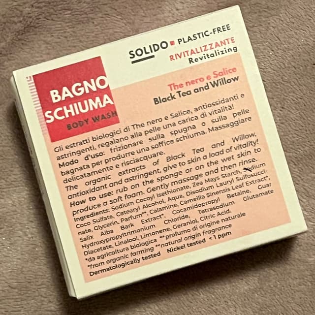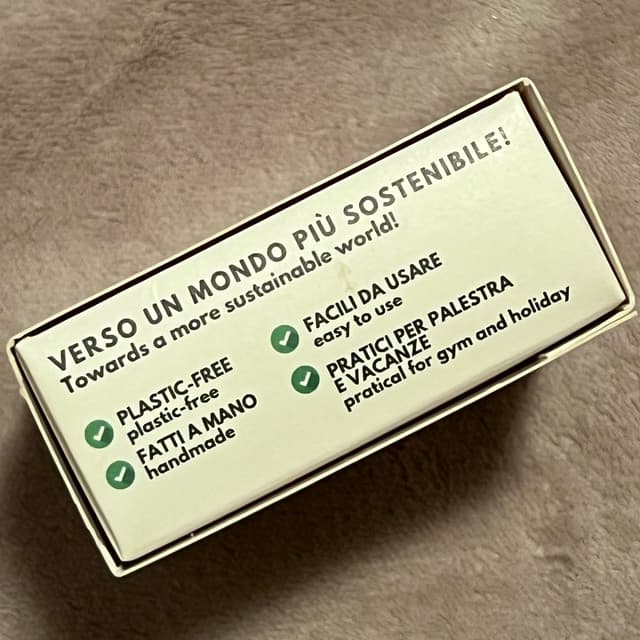 Bagnoschiuma solido con cordicella per essere comodamente appeso.