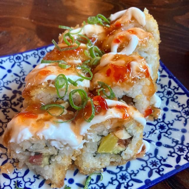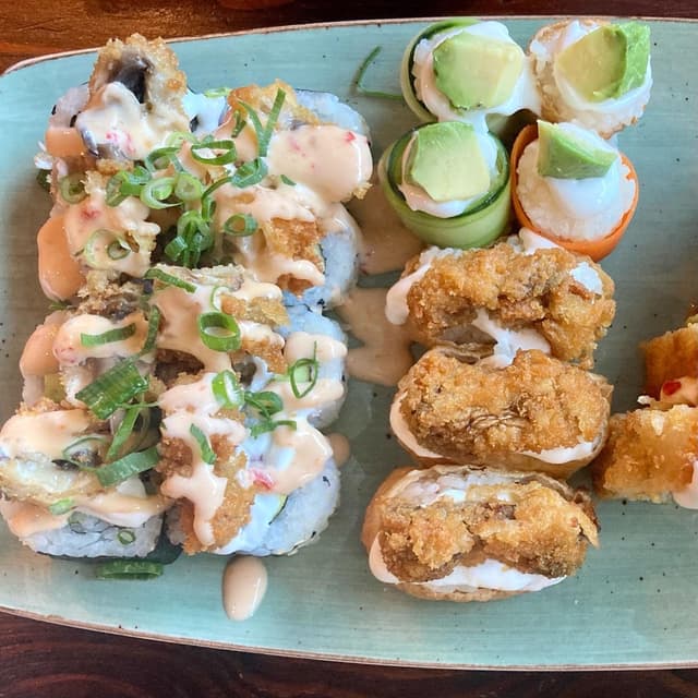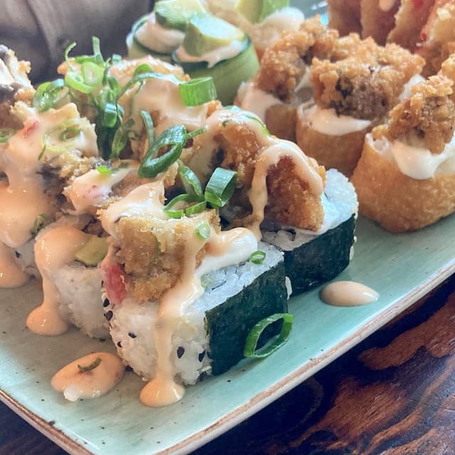 Pictured is: Mushroom Tempura, Vegan Tona, Roses 4 Season, Avo Inari and possibly a few more that I can’t remember!! 😅