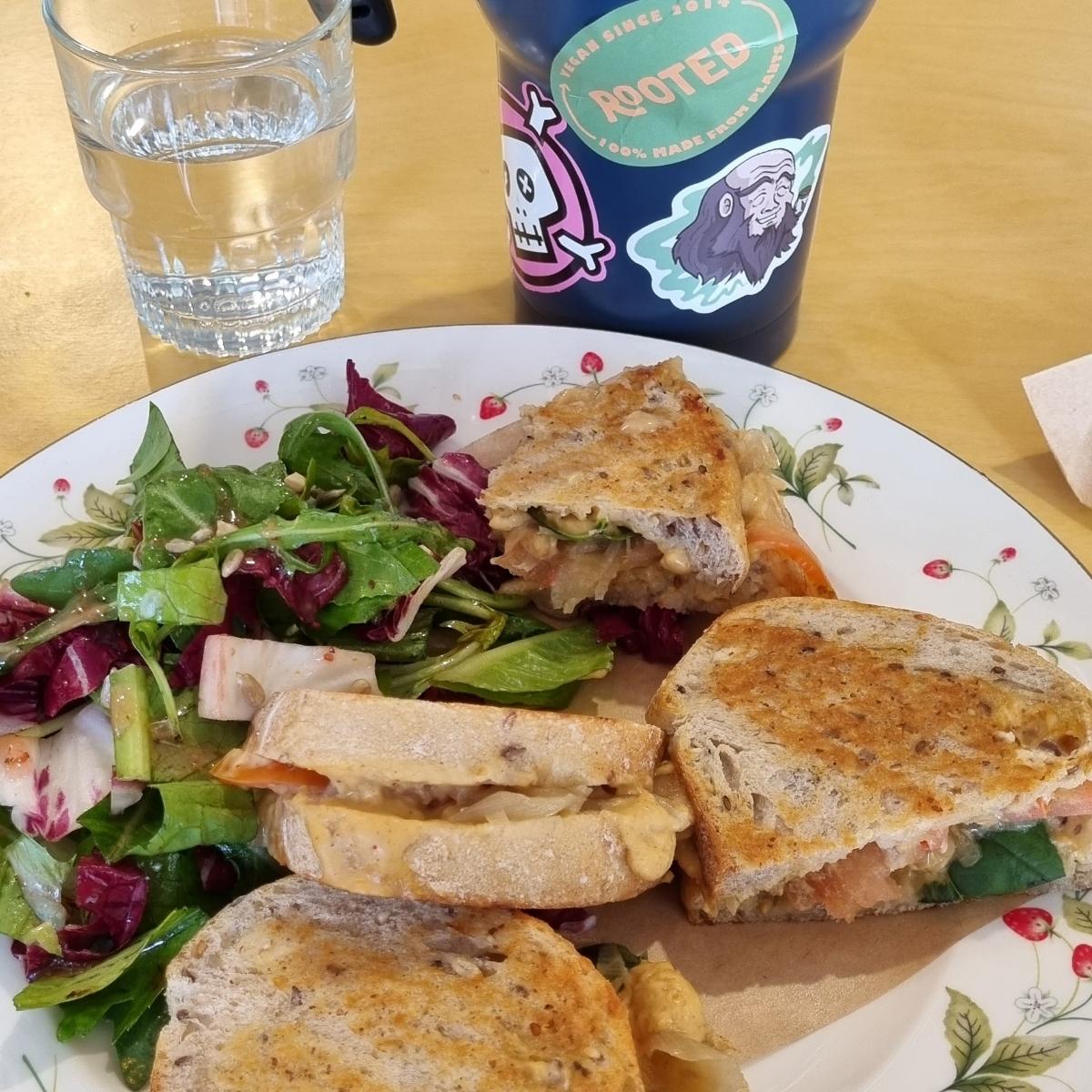 The bread is baked fresh, cheese is delicious. Love the tomato on the sandwich. Salad dressing is good, but the salad itself can be improved with some more ingredients. Overall very delicious and comforting dish!
