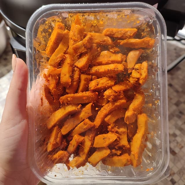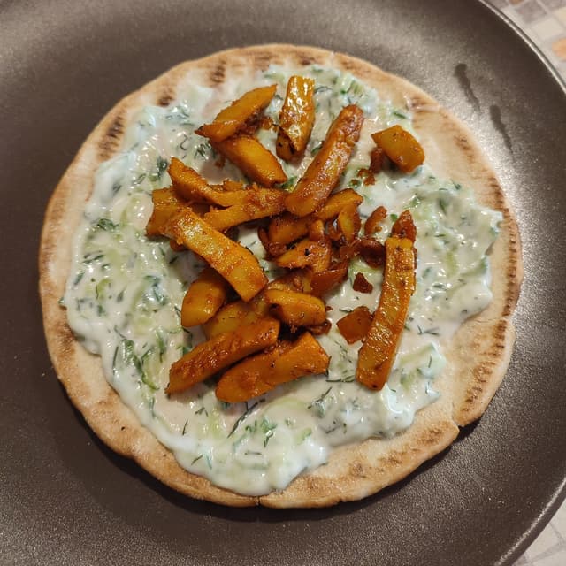 After the delicious vegan chicken pieces from the same brand, the bar was set super high. I expected a lot and in terms of the texture of the pieces, they were perfect. I didn't really care for the spices, though 😐 They were not bad at all, it's just not how I'd choose to flavor them.. Just like the plain ones, they were great. Probably next time I'd just get the plain pieces and flavor them myself. Still great for a quick homemade gyros 🥙 combined them with some veg, air fried potatoes and vegan tzatziki 😍 Bought from V-delivery 😊 #veganinbulgaria #veganin2022 #veganchicken