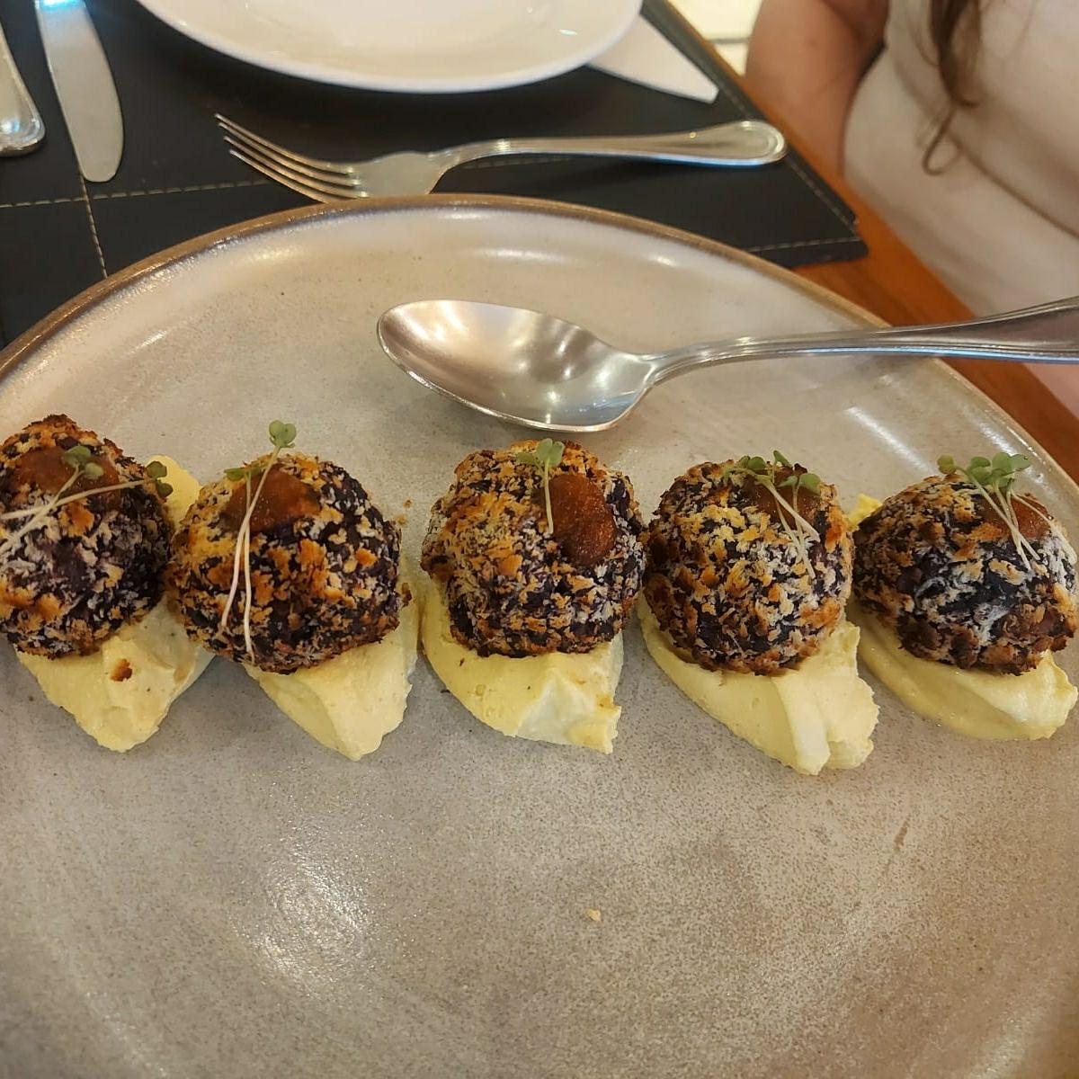 Bolinho de arroz negro com uma maionese bem saborosa e leve. Recomendo esta entrada