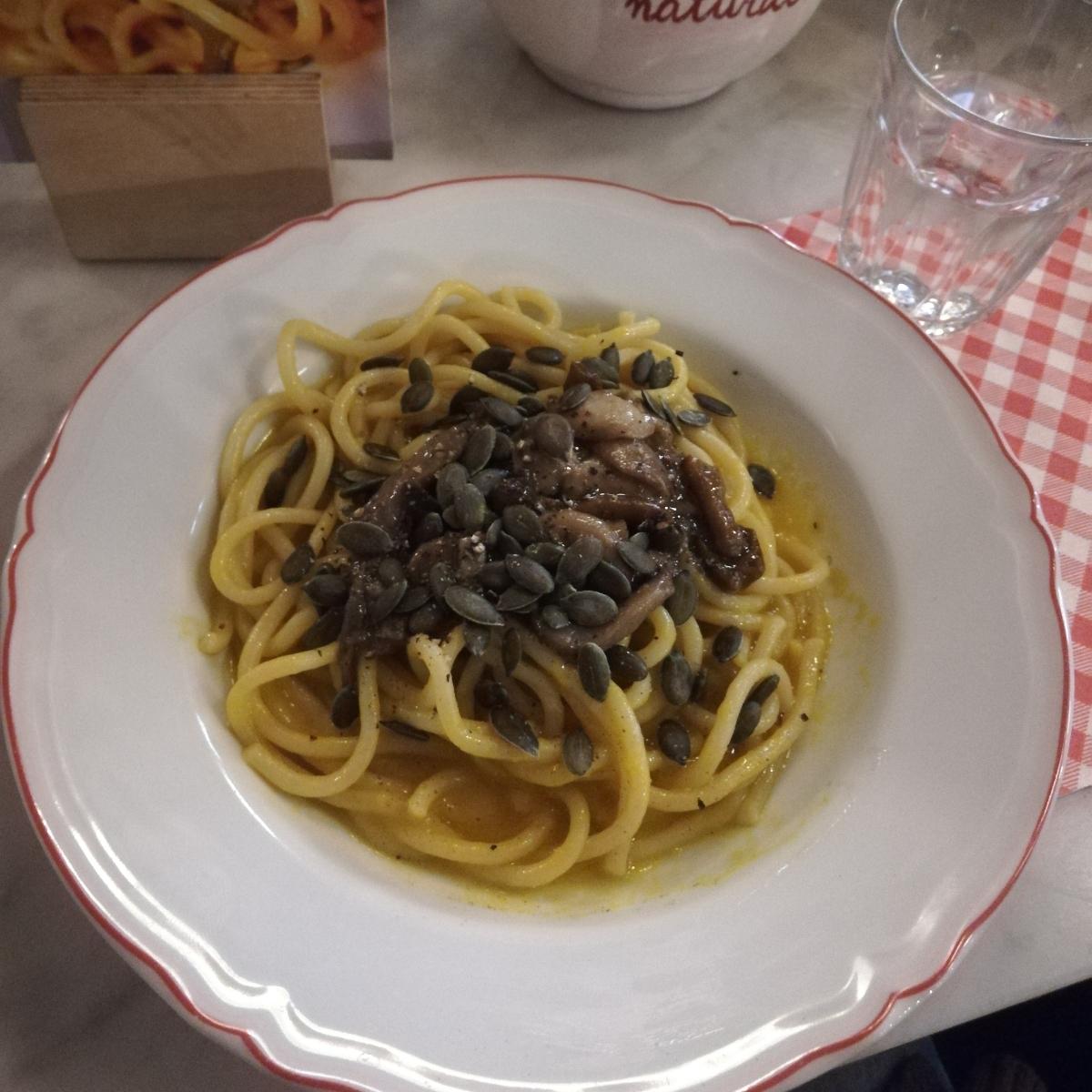 Very tasty I love pumpkin sauce and mushrooms! The pasta is homemade and very good, the sauce is good too and it also had some pumpkin seeds that gave an extra to all of it!