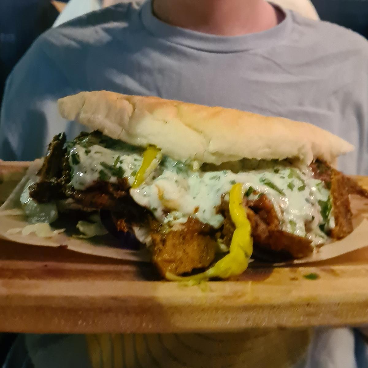Seitan doner, with cabbage, onions vegan tzatziki, tomatoes and chilli sauce.. unbelievable