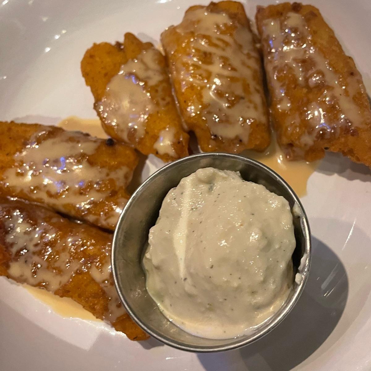 The champs sauce is really good. Tastes like tangy honey mustard. They use Daring brand chick’n tenders and fry them in the deep fryer so they got so crispy. Came with a side of blue cheese dressing. All vegan spot! So awesome!