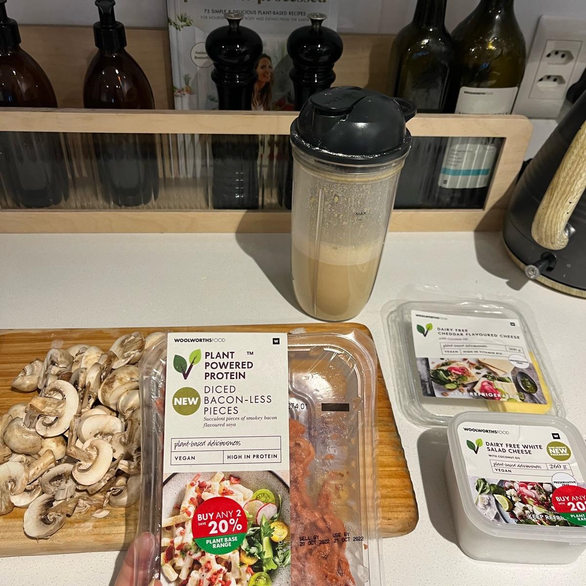 Chickpea omelette time! Filings include the bacon-less bits, vegan feta & cheese