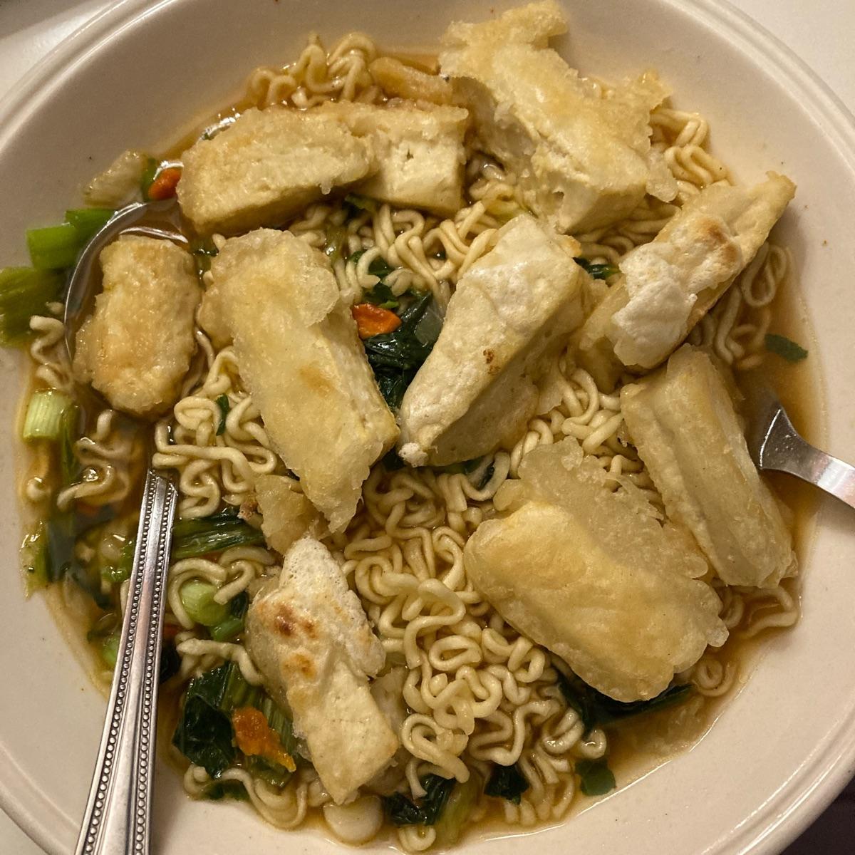 Nongshim veggie noodle soup. My favourite quick noodle soup! This is so yummy! I like to posh up instant noodles with some veg & tofu. Here I’ve got crispy battered tofu & spring onions- so quick & so tasty 🍜