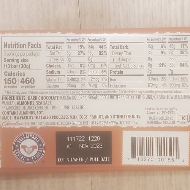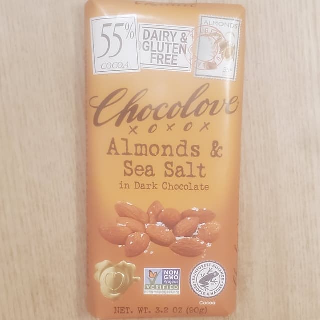 Got this as part of a xmas goodie bag. Not something I'd buy. Gave it to someone, shh. I dont do nonorganic almonds. None of the ingredients are organic. Chocolove is rated not an ethical chocolate by slavefreechocolate.org and FEP. 32g added sugar in the bar. I'd bet it's delicious but no thanks.