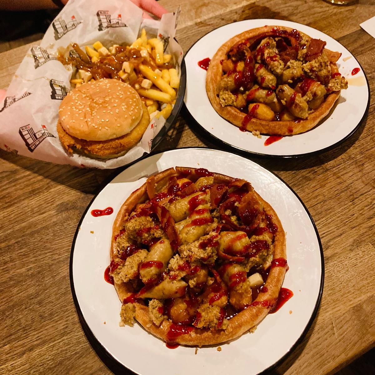 Incredible Christmassy food! Perfectly cooked Yorkshire pud baste with juicy mini sausages, crispy bacon and tater tots, stuffing, and slightly spicy cranberry sauce. Soooooo yummy. Quite pricey compared to other Bloc offerings but really unique, filling, and 100% worth it. #veganchristmas #christmas #vegansausage #veganbacon #yorkshirepuddings