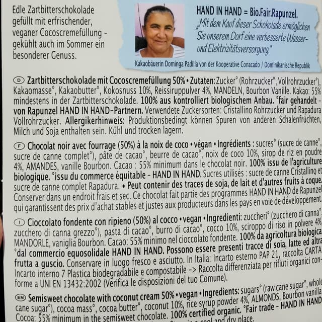 Acquistato insieme ad altri prodotti da Sorgente Natura, online. Il cioccolato è sicuramente di buona qualità, il cocco si sente ma è decisamente troppo dolce per i miei gusti.
