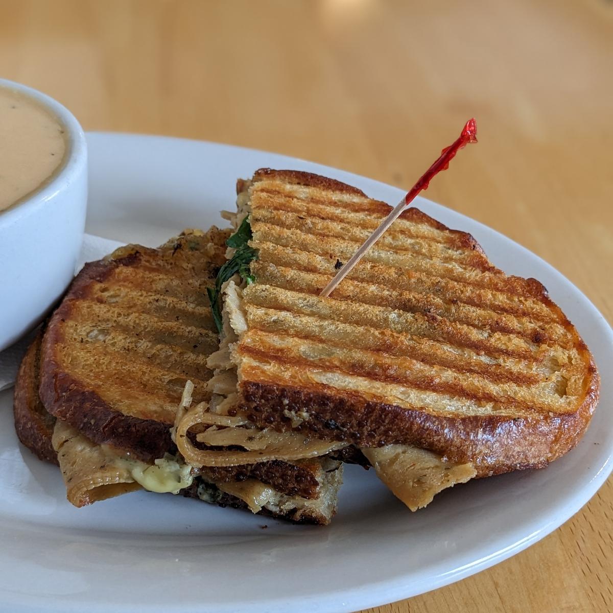 Eating at Vegan East really makes a difference! I've had their sandwiches plenty of times before, but they never maintained their crispiness on the walk home. This time the bread was nice and firm, and the fillings were hot! The pesto isn't strong in this sandwich, so it still paired nicely with my cheddar broccoli soup. I love that they use Herbivorous Butcher turkey! The tomato and spinach are appreciated to break up the meat and cheese monotony.