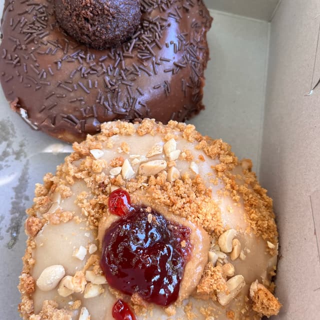 As always, yummy donuts. PB and J flavours can never be faulted. The other one is a chocolate donut with cookie dough. So good!