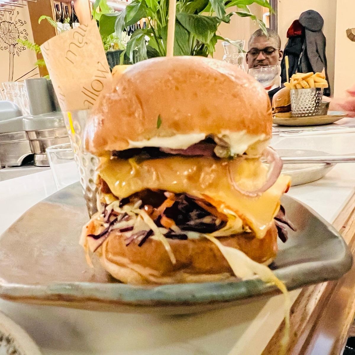 Burger molto buono stile pollo. Con aggiunta di sottiletta vegana. Steeet food? Sì, ma in chiave molto più ricercata e raffinata. Maionese che accompagnava le patatine leggerissima