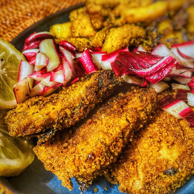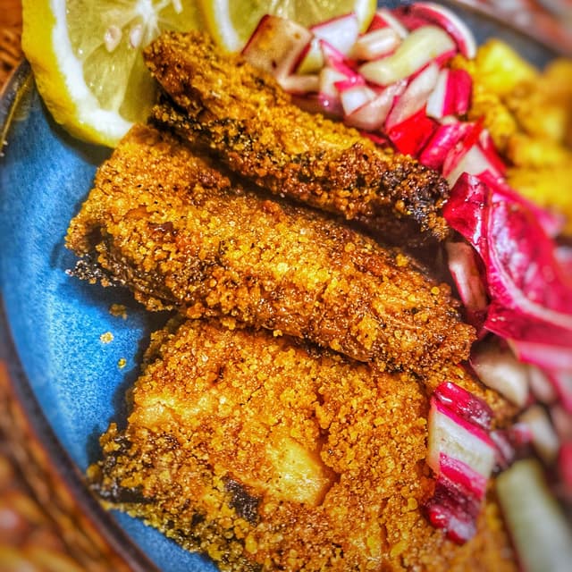 Per far questo piatto , ho utilizzato una base di Tofu bianco al naturale che ho lasciato marinare per diverse ore in un mix di spezie , alghe , odori , poi l’ho avvolto nell’alga nori e l’ho impanato e cotto in forno !