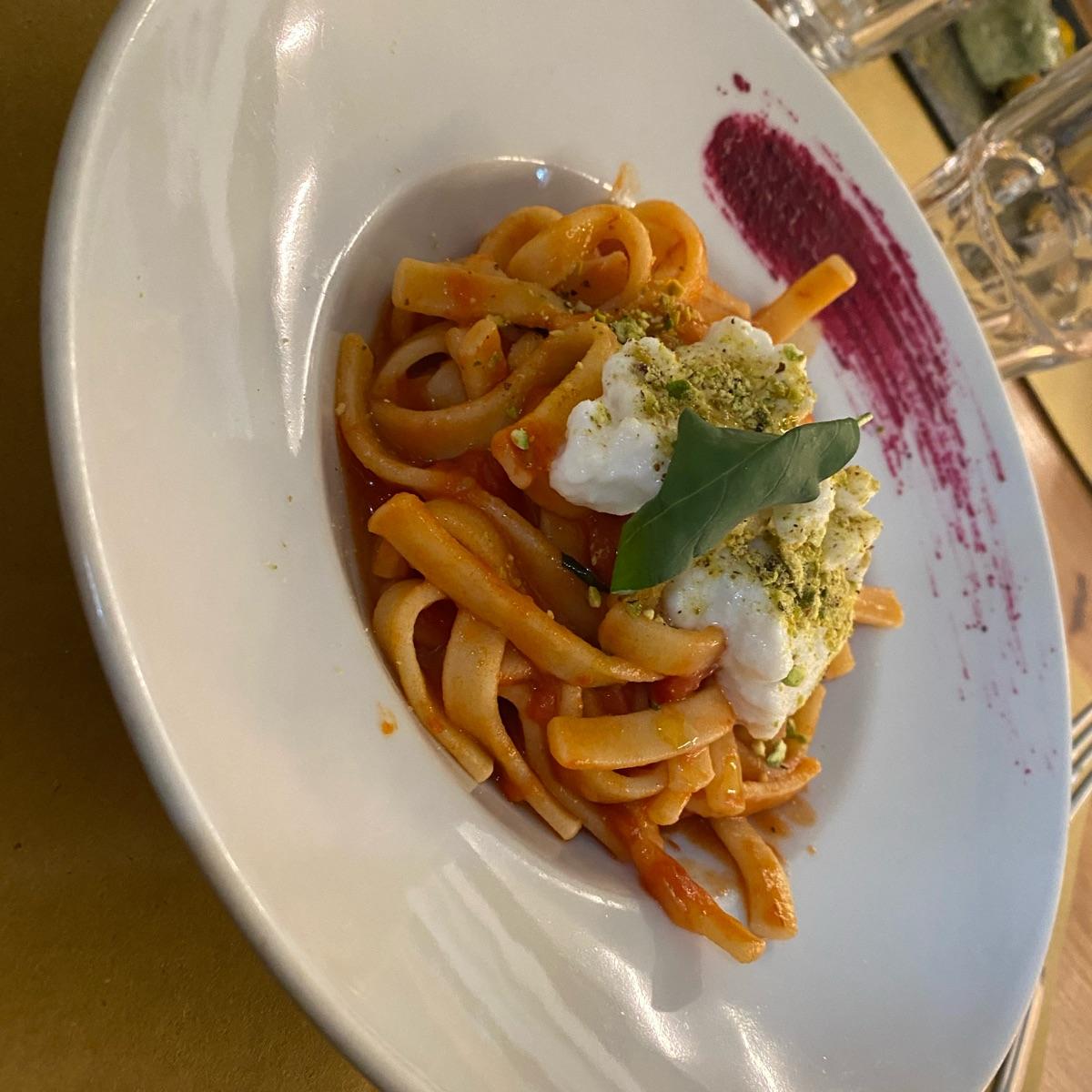 Scialatielli al sugo con stracchino vegetale e granella di pistacchio. Un piatto semplice, ma buono. Grazie Selezione naturale