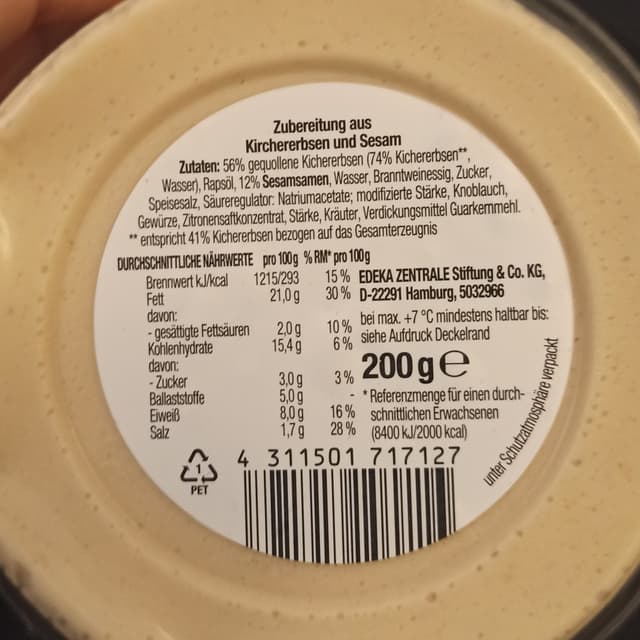 Ready to eat hummus.. I don't want to eat so many spreads in plastic package that I can make by myself but my boyfriend wanted it to eat it directly with bread 🙄 so we bought it from Edeka Supermarket. It has rapeseed oil and sugar and other ingredients that they don't exist at homemade hummus. It costs 0,99€