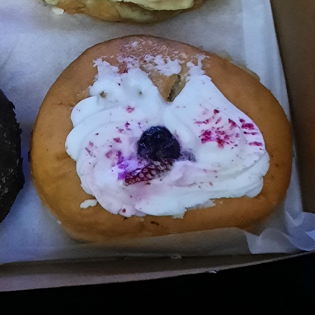 Dona de vainilla frita, rellena de pastelera vegana, mermelada de berries, cubierta de merengue vegano, berries, chunkies crocantes de nuestro merengue y polvo de frambuesa, eso se suponía al menos, pero creo que nos jodieron con la cubierta, difiere mucho de las fotos que suben a sus redes sociales 🍩