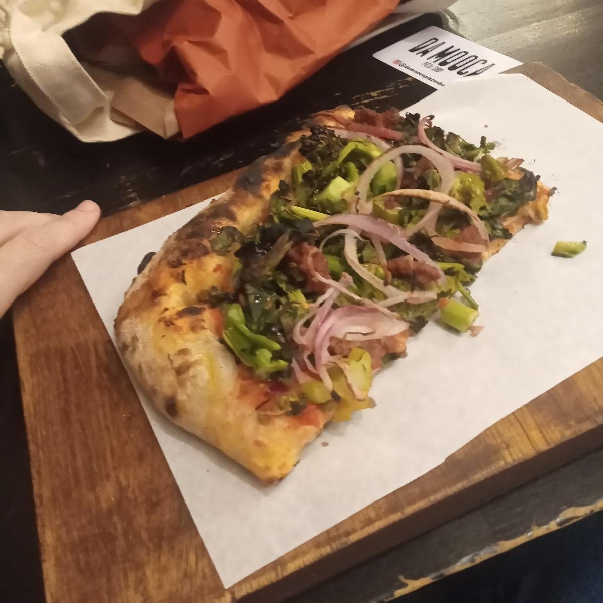 O pedaço da pizza vegana é muito saboroso e bem elaborado, com vários vegetais e pedaços de carne vegana. Um ponto positivo é o preço, muito acessível (R$ 12,00)