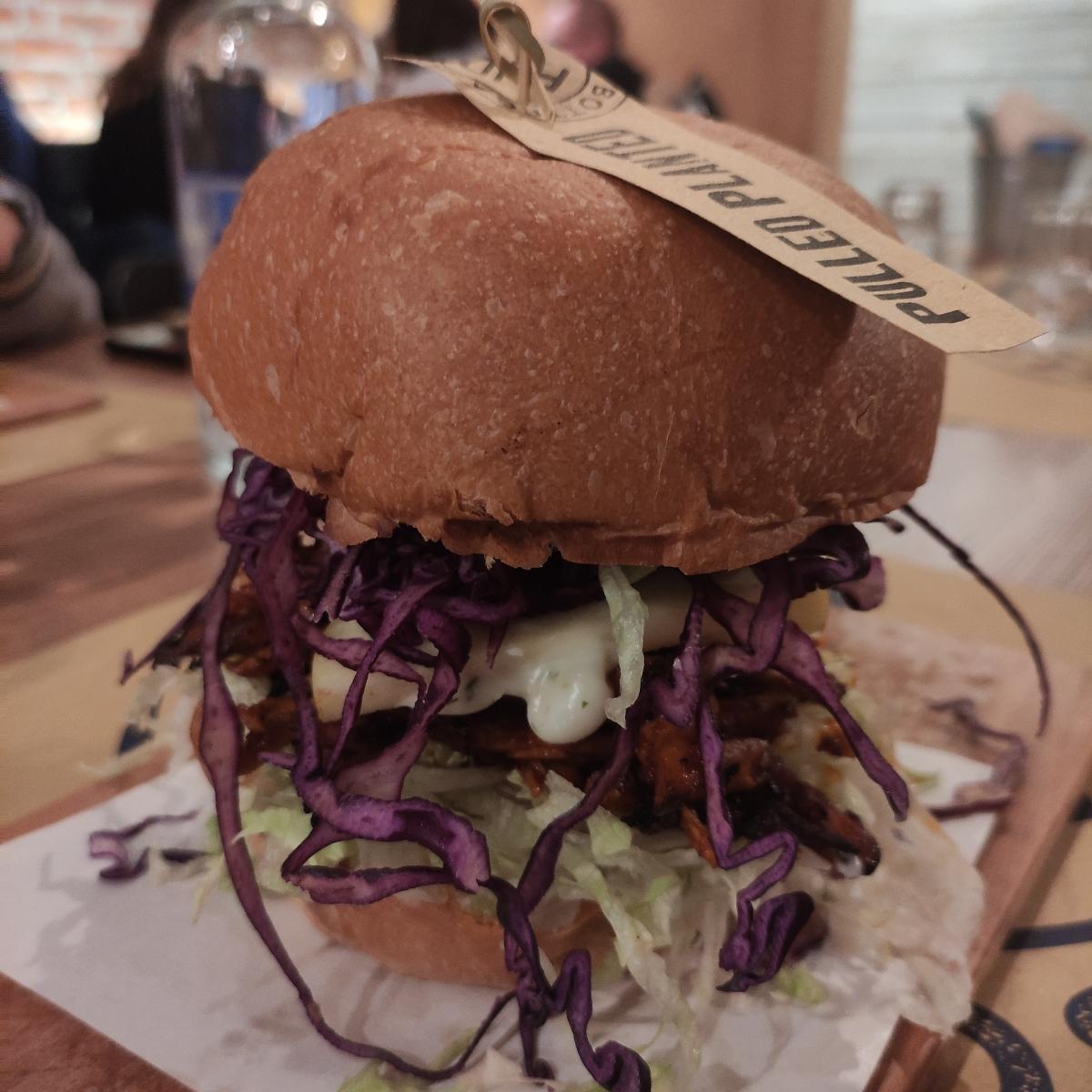 Burger vegano con straccetti speziati- la salsa allo yogurt e la mela lo rendono delicato nonostante le spezie degli straccetti.