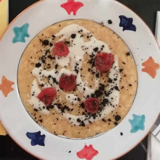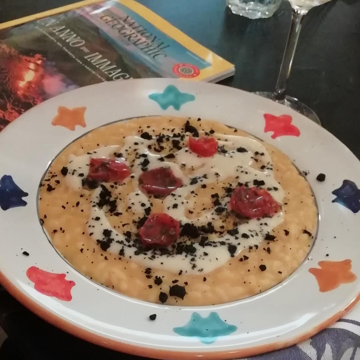 Molto buono e ben cotto il riso, ma risotto un po' dolce nel complesso perché i pomodorini e la polvere di olive non riescono a bilanciare del tutto la dolcezza della zucca.