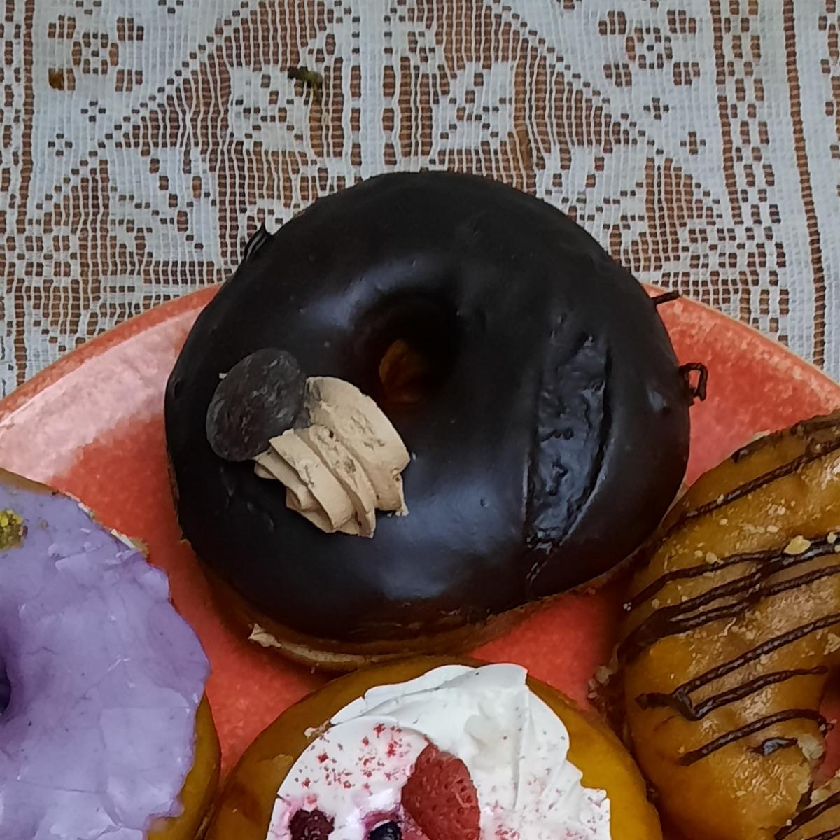 Dona de vainilla frita, rellena de crema de café vegana y cubierta con chocolate fundido ☕️