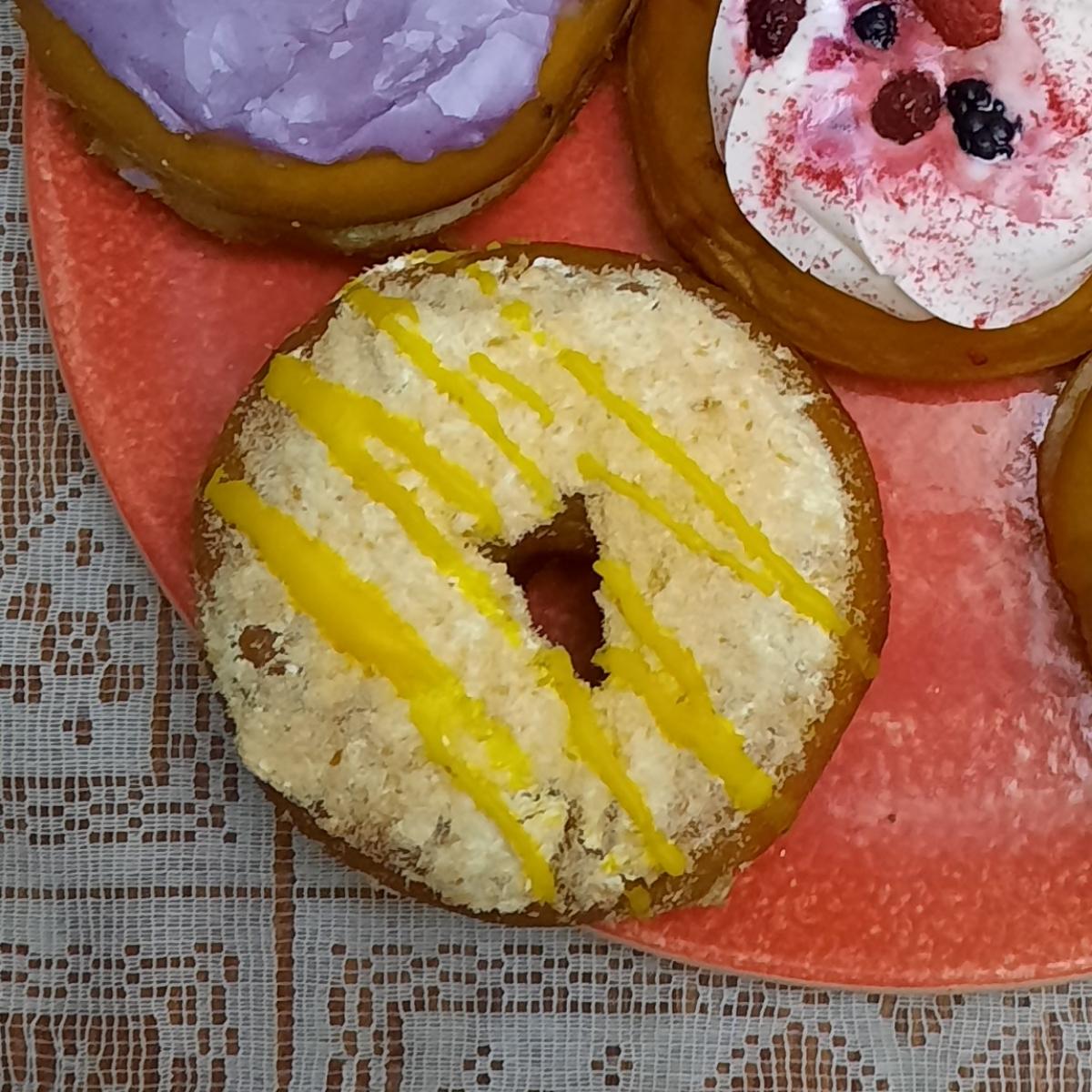 Dona de vainilla frita, rellena de crema de mango y maracuyá y una cobertura de crema vegana y coco tostado. Lo malo es que era solo una edición limitada 😿🍩