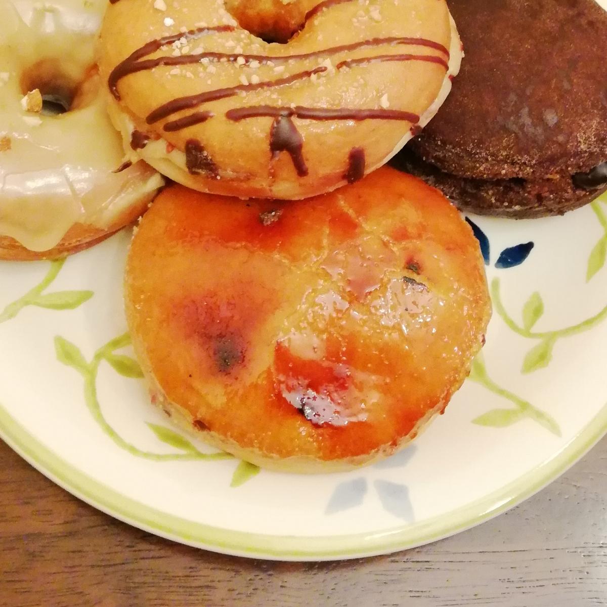 Dona de vainilla frita, rellena de crema pastelera vegana a base de soja y cubierta de azúcar caramelizado. En ocasiones distintas me ha tocado con el caramelo muy creme brulee y otro como azúcar derretida no más 💁🏿♀️