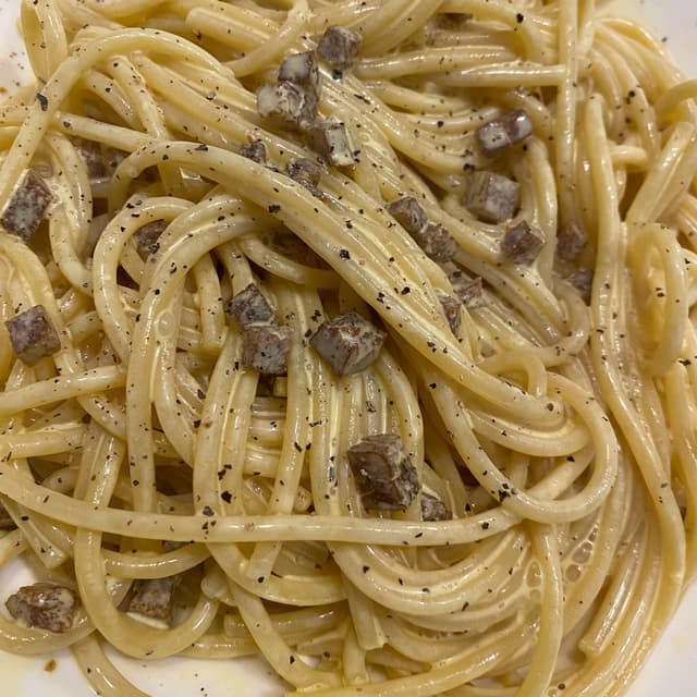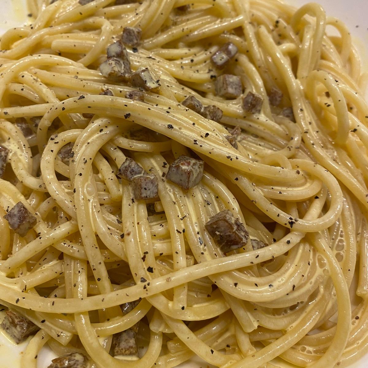 🇬🇧 with this vegan creme I tried to make a vegan carbonara, I added zafferano to recreate the color and then I added some pepper. I was missing some vegan Parmesan. Then I added some Seitan cubes