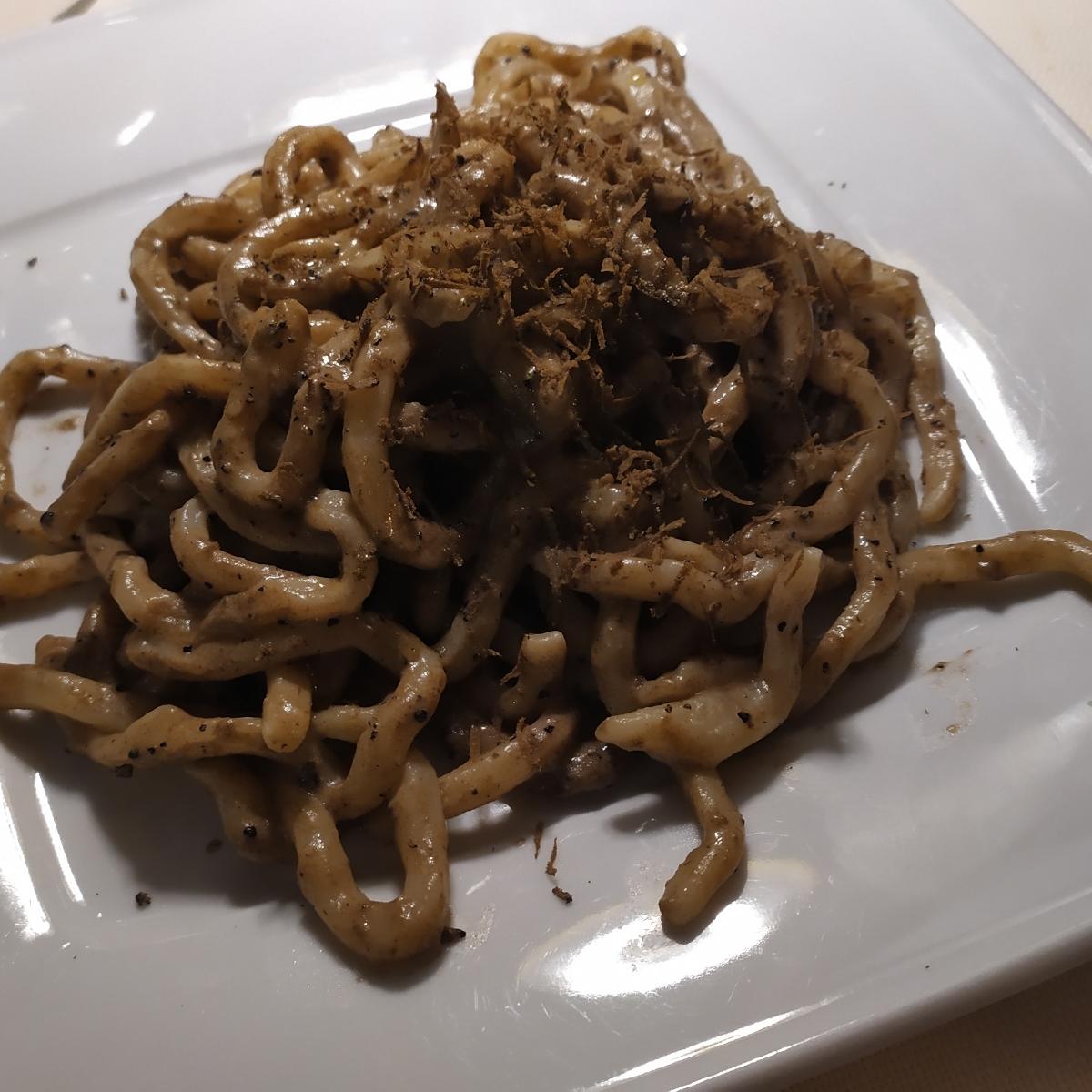 Un piatto semplice della tradizione Umbra, già vegano (non veganizzato) a base di pasta fatta in casa acqua e farina con tartufo grattugiato. Davvero squisito!!