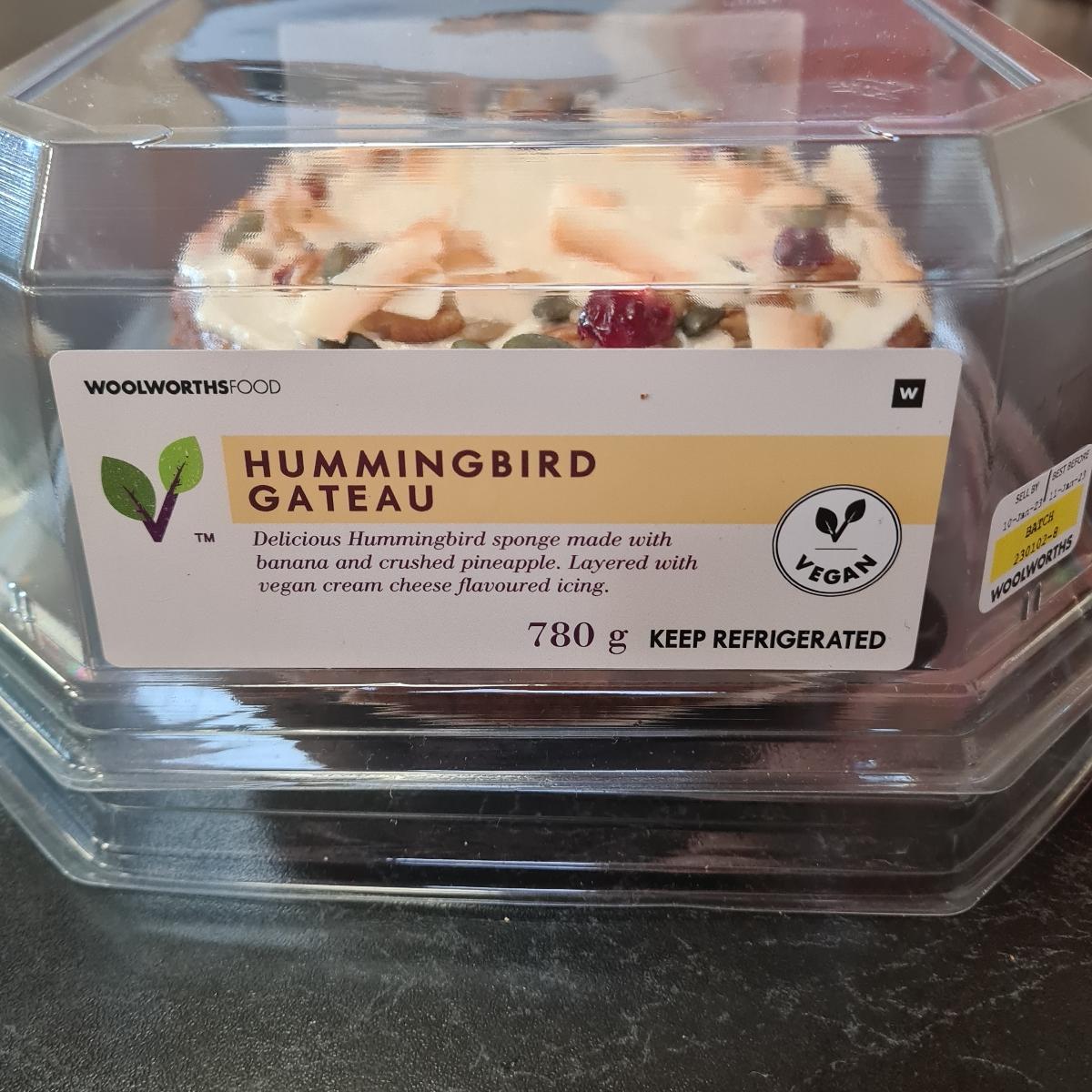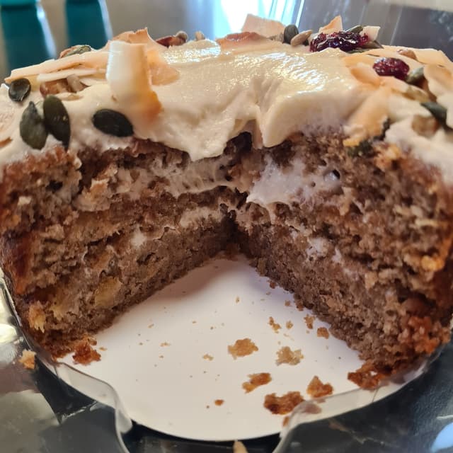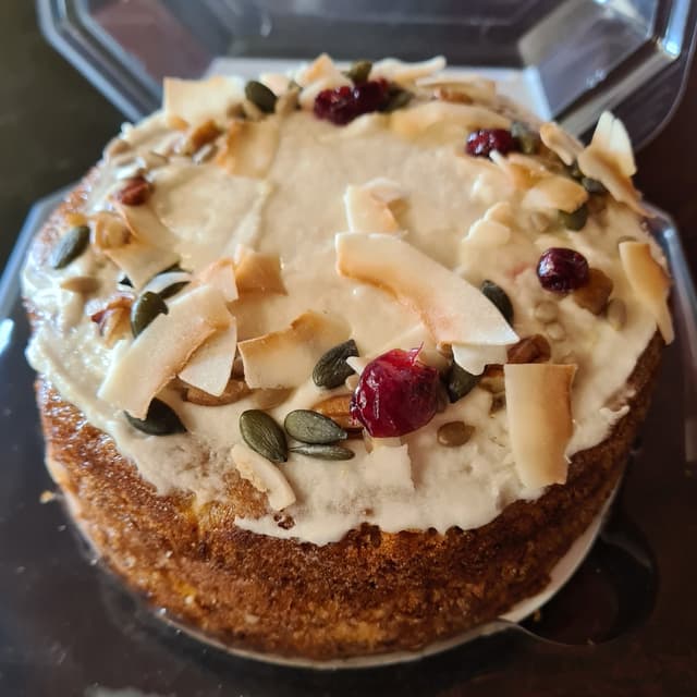 Topped with cranberries, coconut flakes and pumpkin seeds with a centre and top layer of cream cheese. The cake is soft and moist. The banana and pineapple are prominent and give an almost velvety taste.
