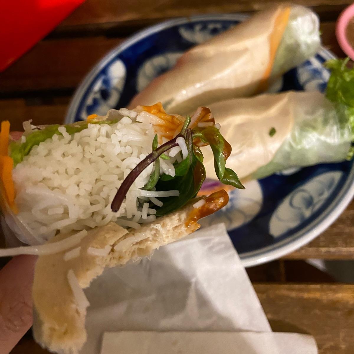 This spring roll is wrapped with mock ham slices and TONS of rice vermicelli - too much, in fact. I would not recommend this!