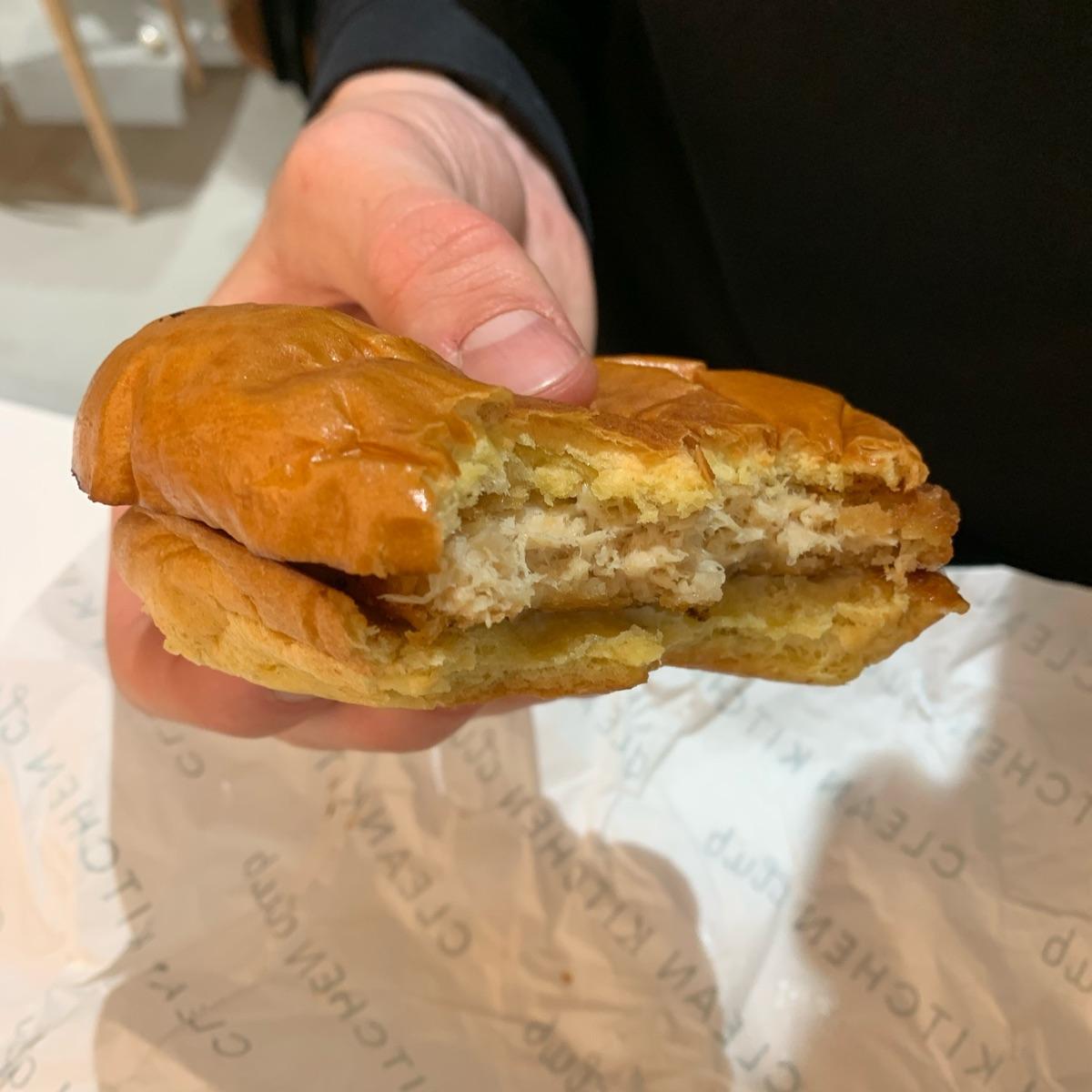 Il mio ragazzo ha preso questo burger di pollo (senza lattuga e cetrioli x lui). Buonissimo, consistenza del fake pollo super interessante!