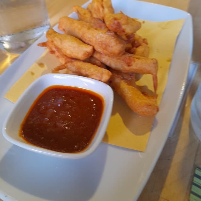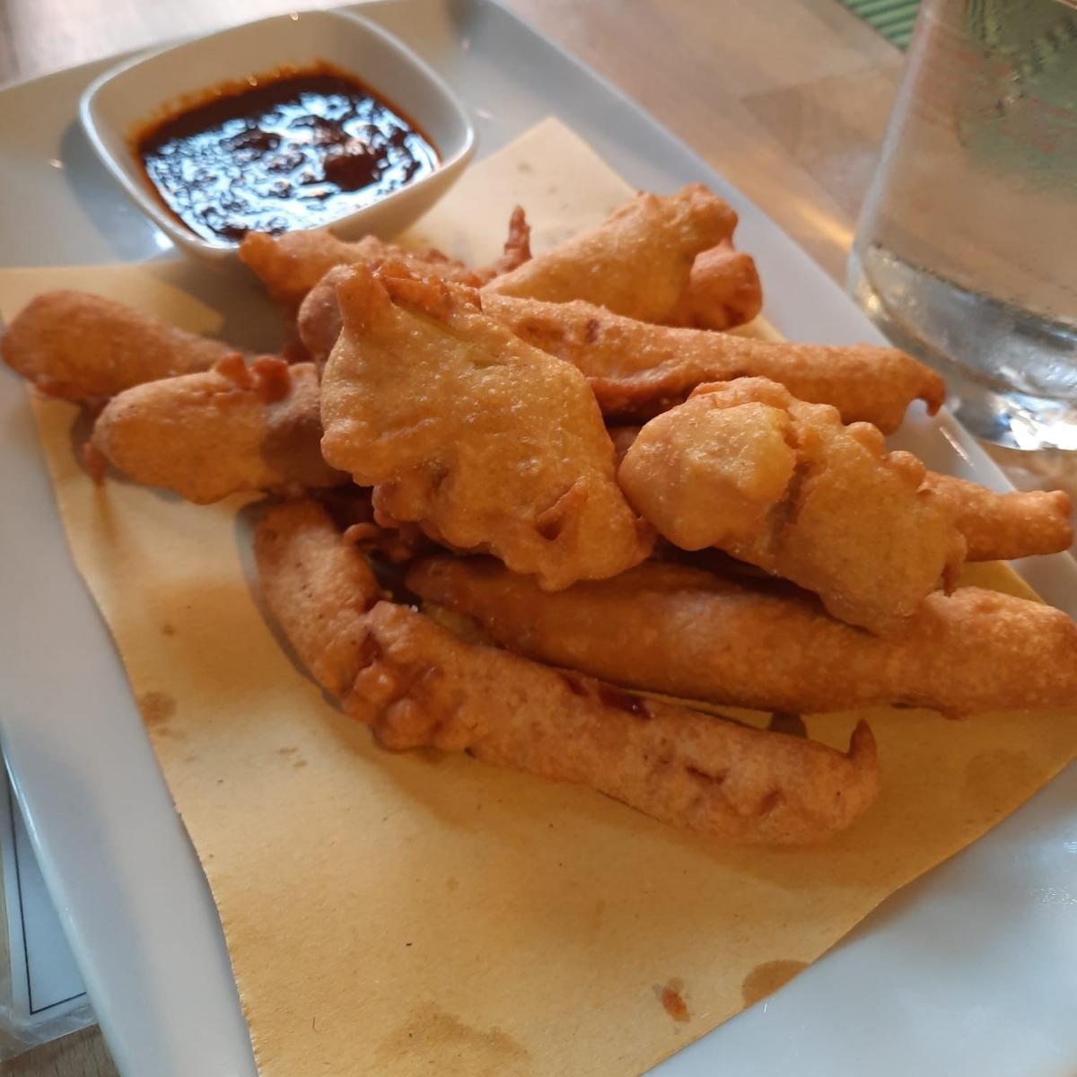 Frittura di verdure in pastella di ceci con salsa affumicata, molto buona, forse avrei preferito la verdura tagliata più fina per rendere il tutto più croccante.