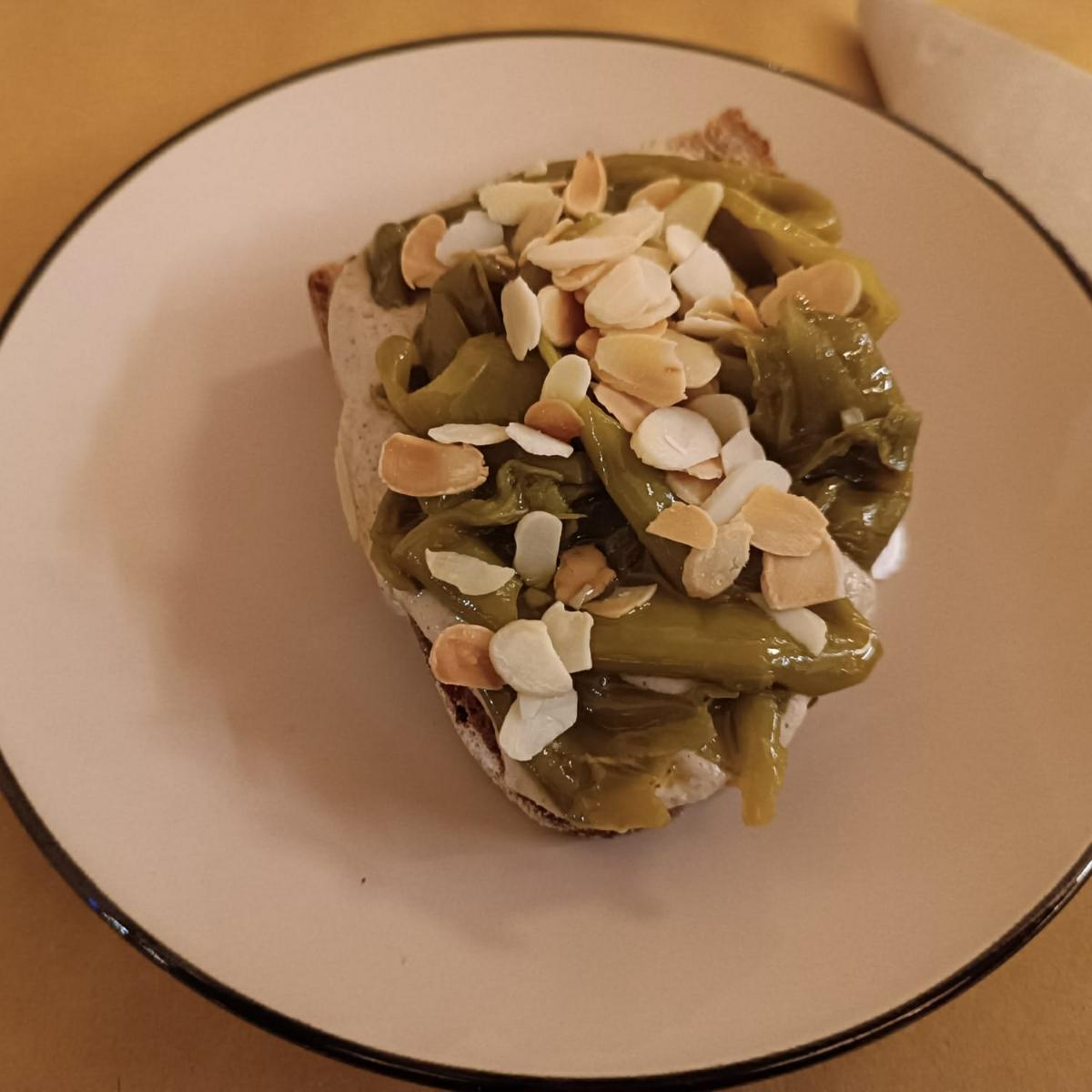 delicious homemade creamy cheese (yummy!!) plus friggitelli (small peppers) and almonds. I love it