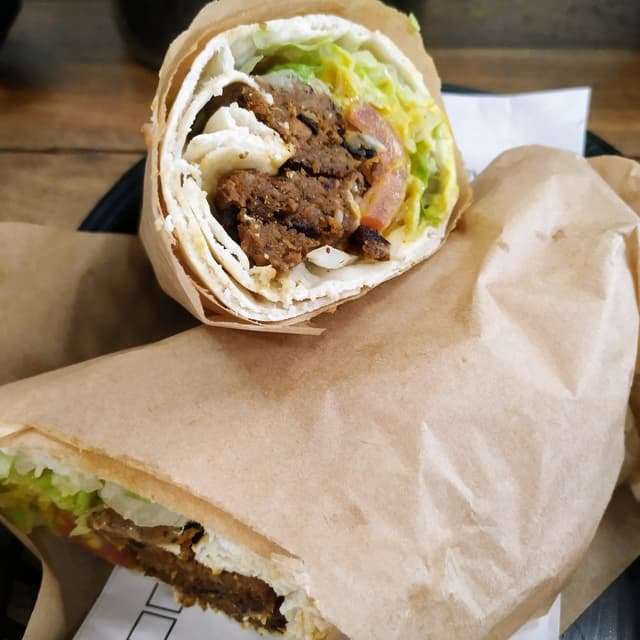 Tasty vegan kebab. First time I tried it. There was quite a bit of the vegan protein in the pita wrap, with some lettuce, tomato, onion and I chose mustard for the sauce. It was quite filling and enjoyable! 😋