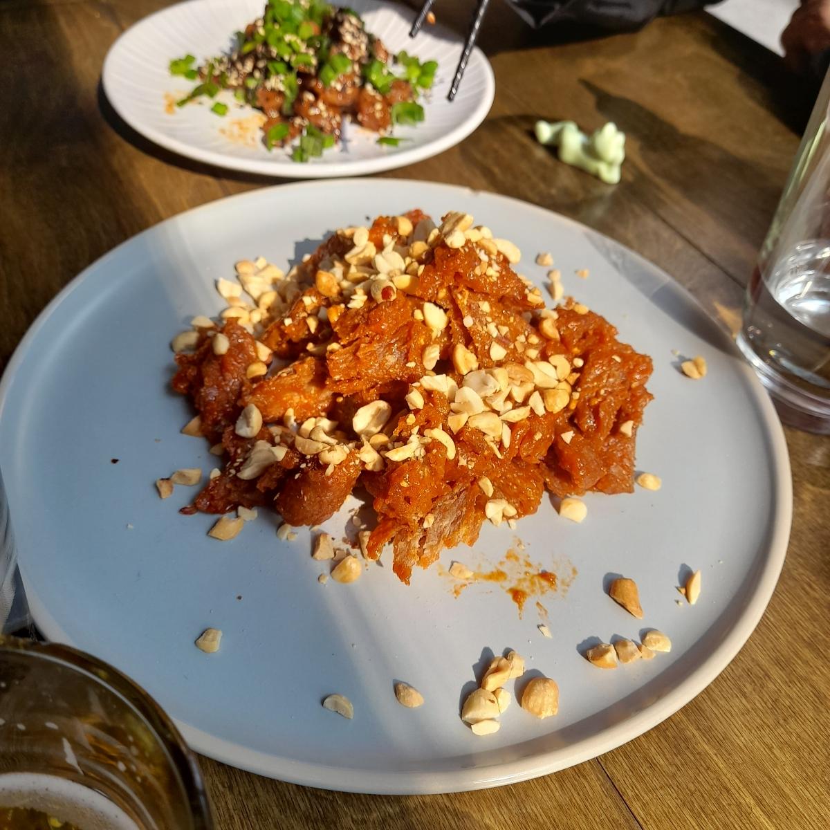 proteína de soja estilo coreano. en el menú dice que es "picante, dulce y adictivo". confirmo.