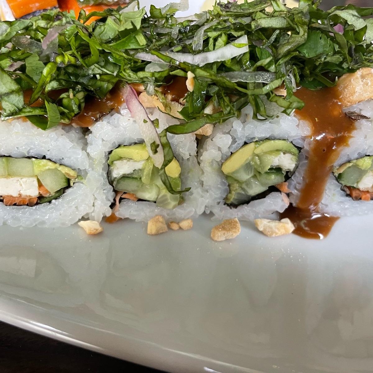 Tofu vegan tempura, avocado, cucumber, carrot, cashews with thai basil, cilantro, mint and red onion salad, and thai peanut sauce for $11.