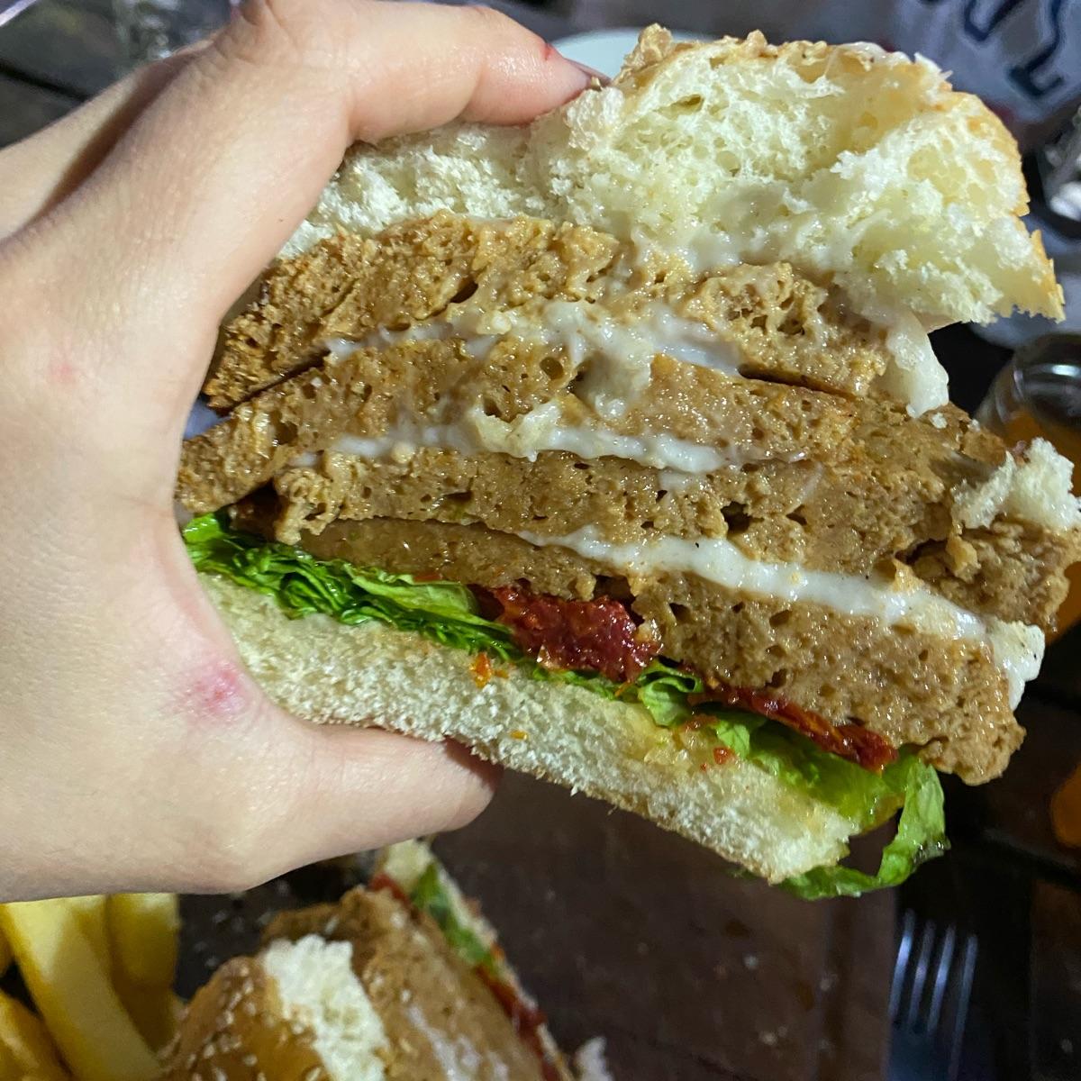 Es enorme, son 4 patys de seitan, con queso felices las vacas, tomates caramelizados y lechuga, está rica pero es enorme, no la pude terminar, viene con papas, me salió $1900